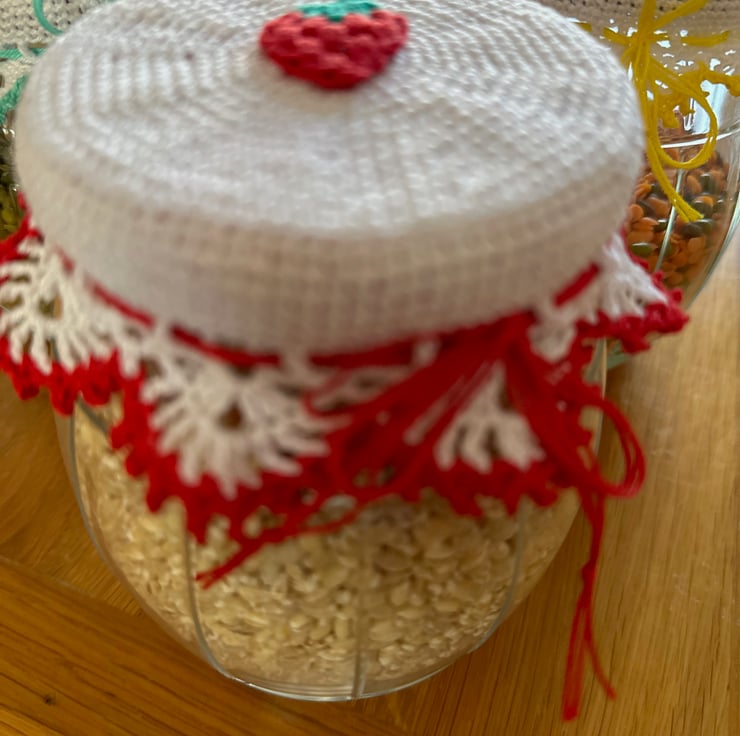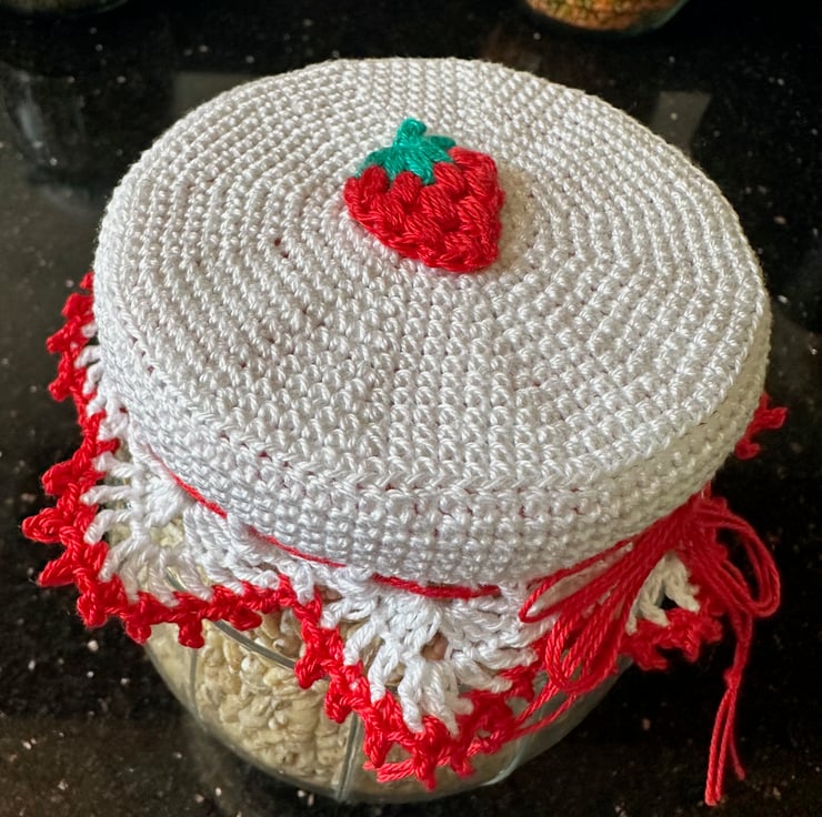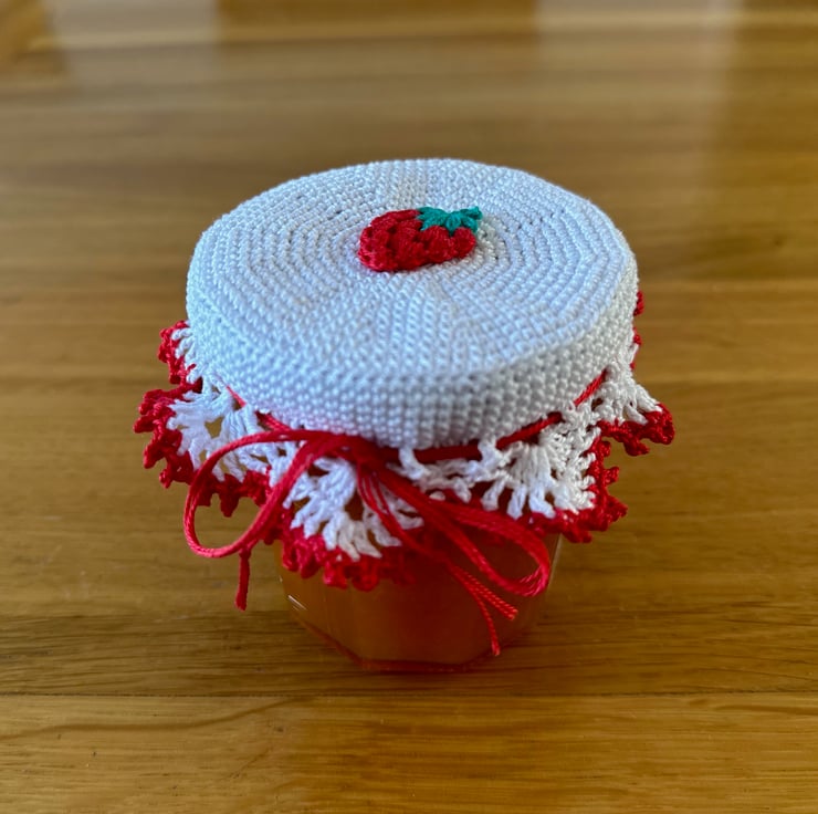 The crochet jam jar lid cover would fit lids measuring approximately 8cm - 8.5cm (3") in diameter.