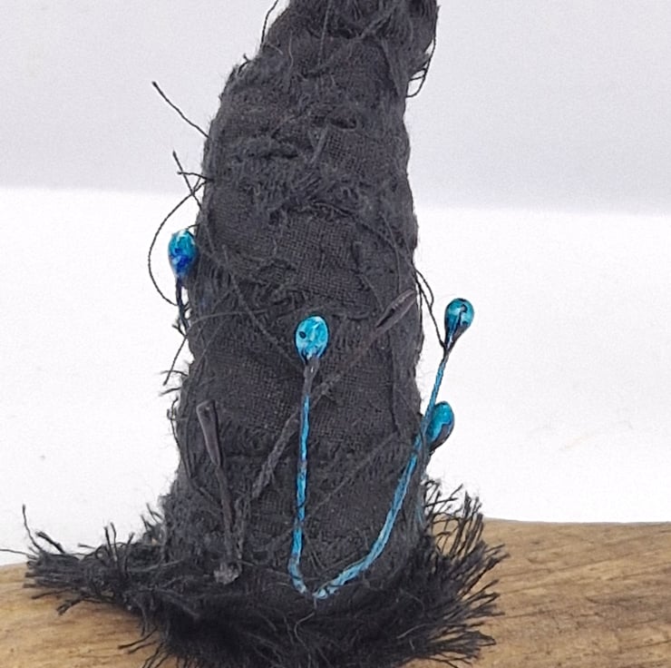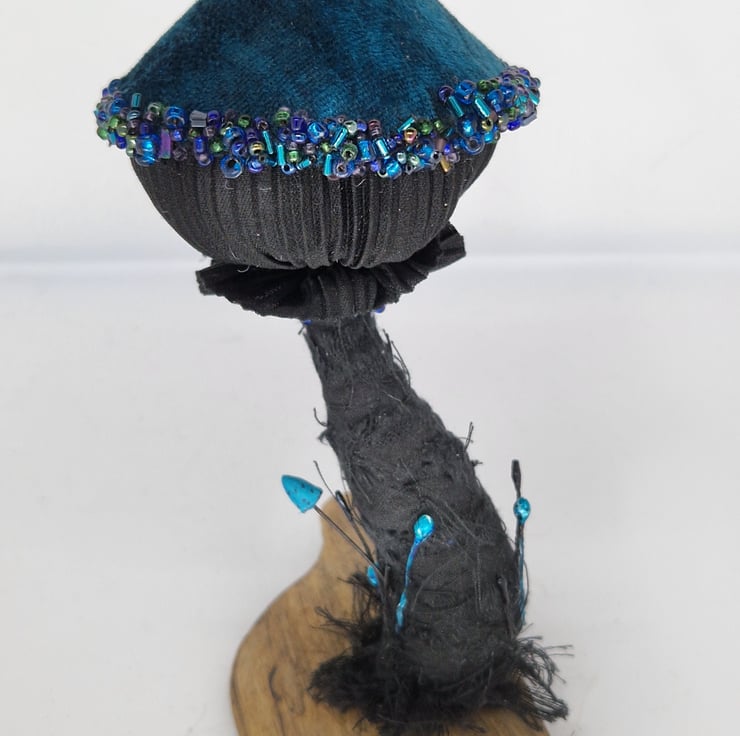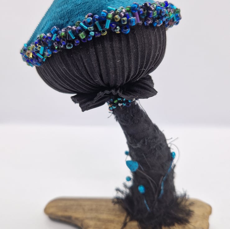 Hand crafted velour velvet mushroom fabric sculpture in beautiful Teal/Turquoise with Black recycled gills and stalk it is made with a wire frame so it is slightly flexible. The plush cap is adorned with individually hand sewn beads and there are painted spores around the base which is mounted on a piece of driftwood.Each mushroom is made from my own patterns and designs.