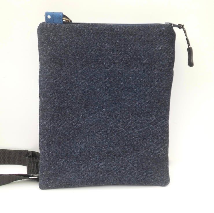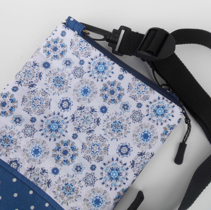 Made using a blue and white printed cotton teamed with a blue and white spotted cotton to the front. The back is navy denim. I backed all the fabrics with felt and machine stitched three rows with a wave stitch across the white fabric, and top stitched the lower half with black thread. Lined with a coffee and white spotted cotton fabric.
