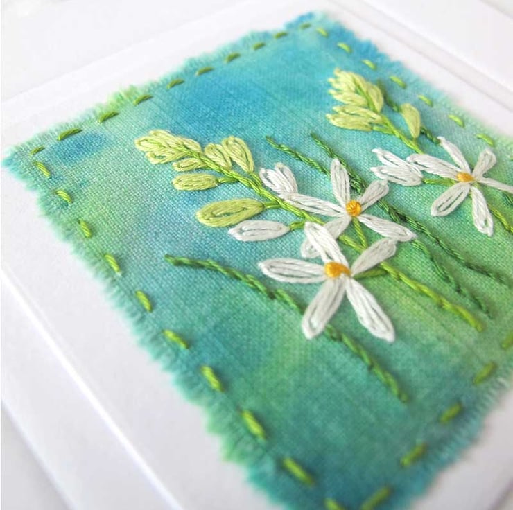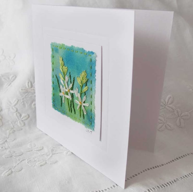This beautiful card has been embroidered by hand onto fabric that I have dyed in shades of green and turquoise. The design is of white star shaped flowers on a stem of buds - perfect for a special occasion, or perhaps framing it as it is. It has been mounted on a card base and is surrounded by an embossed square. The card has been left blank for your own message.