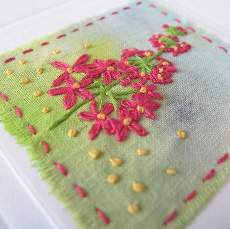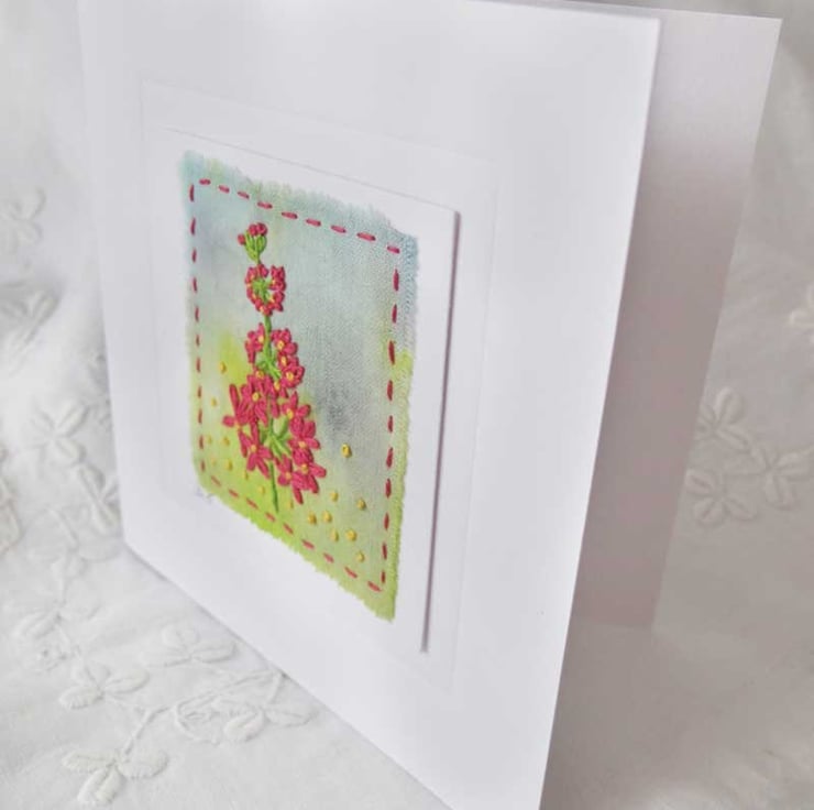 This beautiful card has been embroidered by hand onto fabric that I have dyed in shades of green, blue and grey. The design is of a Primula style flower in a deep pink - perfect for a special occasion. It has been mounted on a card base and is surrounded by an embossed square. The card has been left blank for your own message.
