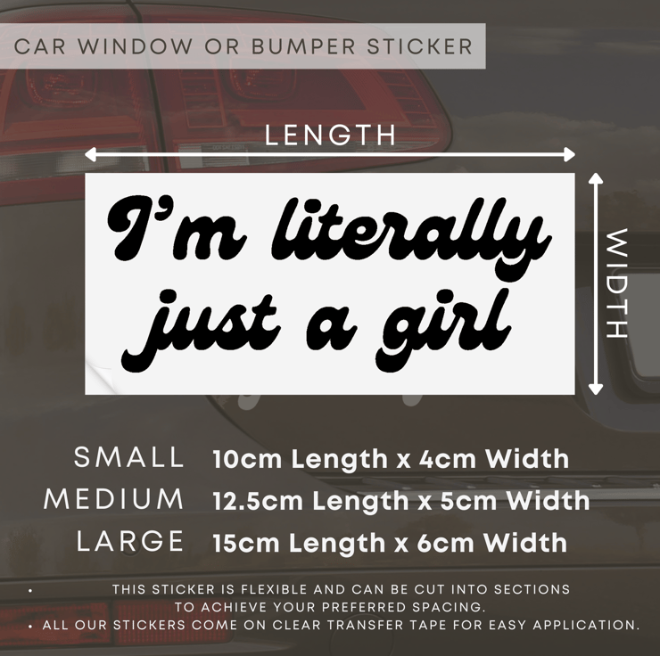 Perfect for adding a touch of personality to your vehicle, the "I'm literally just a girl" car sticker is a great way to showcase your individuality and sense of humour on the road. With three different sizes to choose from and a variety of colours available, you can customise this fun decal to suit your style. Whether you're looking to make a statement or simply add a playful touch to your car, this sticker is sure to turn heads and spread smiles wherever you go.