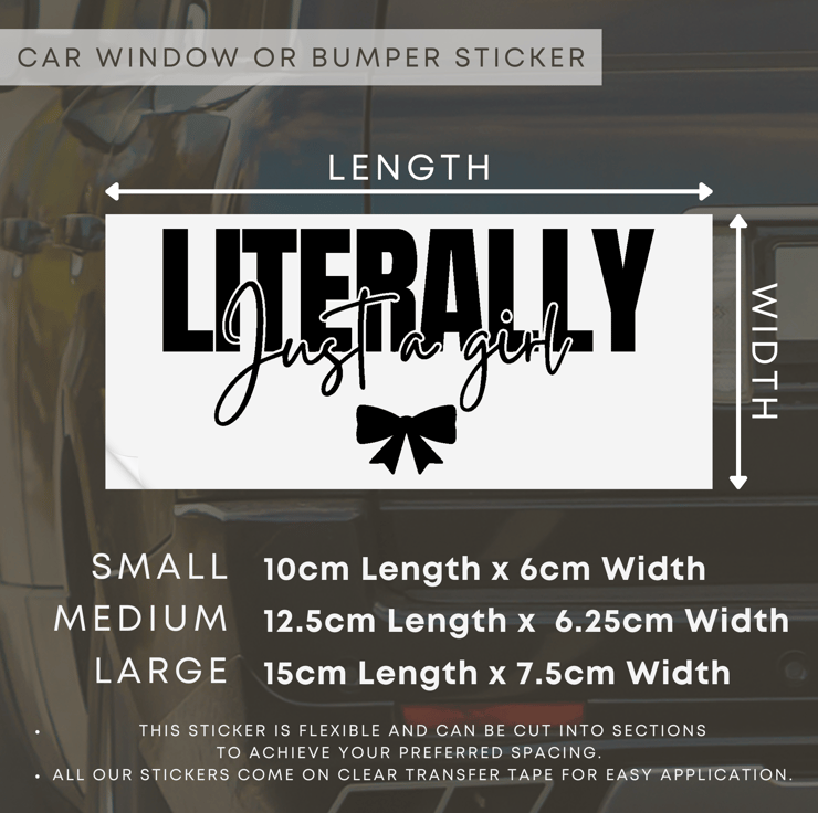 Perfect for adding a touch of personality to your vehicle, the "I'm literally just a girl" car sticker is a great way to showcase your individuality and sense of humour on the road. With three different sizes to choose from and a variety of colours available, you can customise this fun decal to suit your style. Whether you're looking to make a statement or simply add a playful touch to your car, this sticker is sure to turn heads and spread smiles wherever you go.