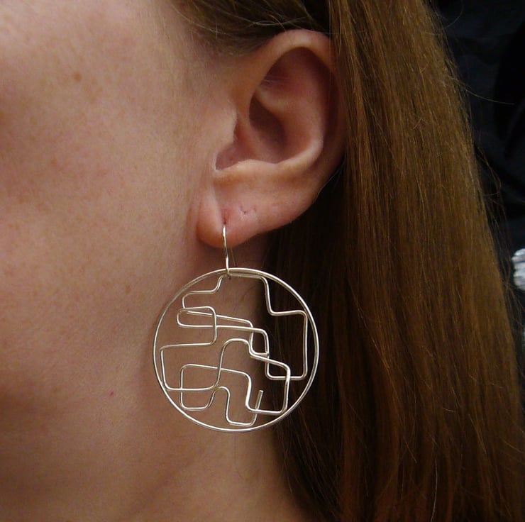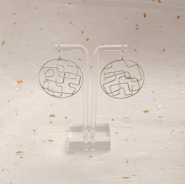 I have created these earrings by shaping recycled sterling silver wire into two different but similar shapes. To create stability, I soldered parts of wire together. I then joined the shaped wire to the insides of handmade silver rings. After filing and polishing, sterling silver ear hooks were attached to the earrings. The earrings are part of a small collection of shaped wire jewellery.