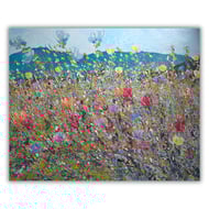 This colourful painting of the coast is ready to hang. In this landscape we see a rough sea lashing against the coastline. The sky has been painted with sweeping brush strokes, blending the colours as I go. The cliffs in the distance and foreground have been painted with a knife and various mark-making tools. The sea has been painted with quick, sharp brush strokes to give a sense of energy and power.