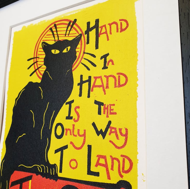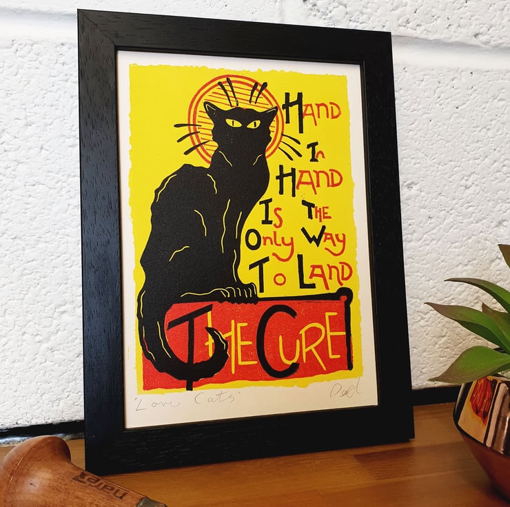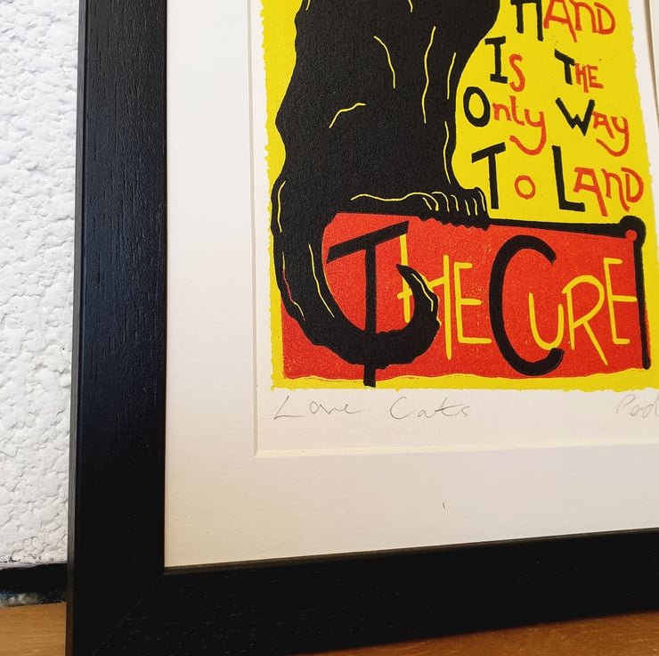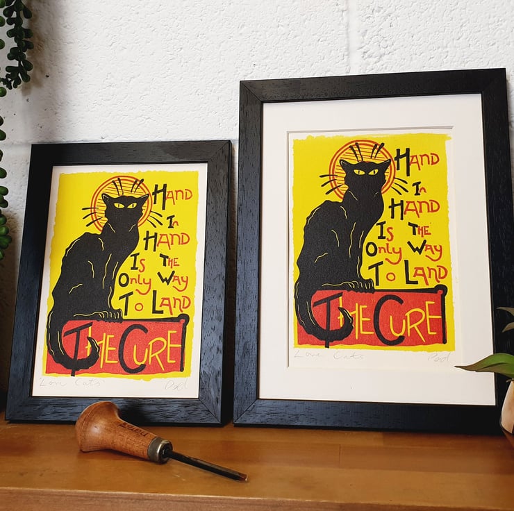 Using the poster but tweaking it slightly to suit a smaller lino print and adding the lyrics of The Cures famous song Love Cats. the background is a ink wash and then a 2 colour lino print on top.