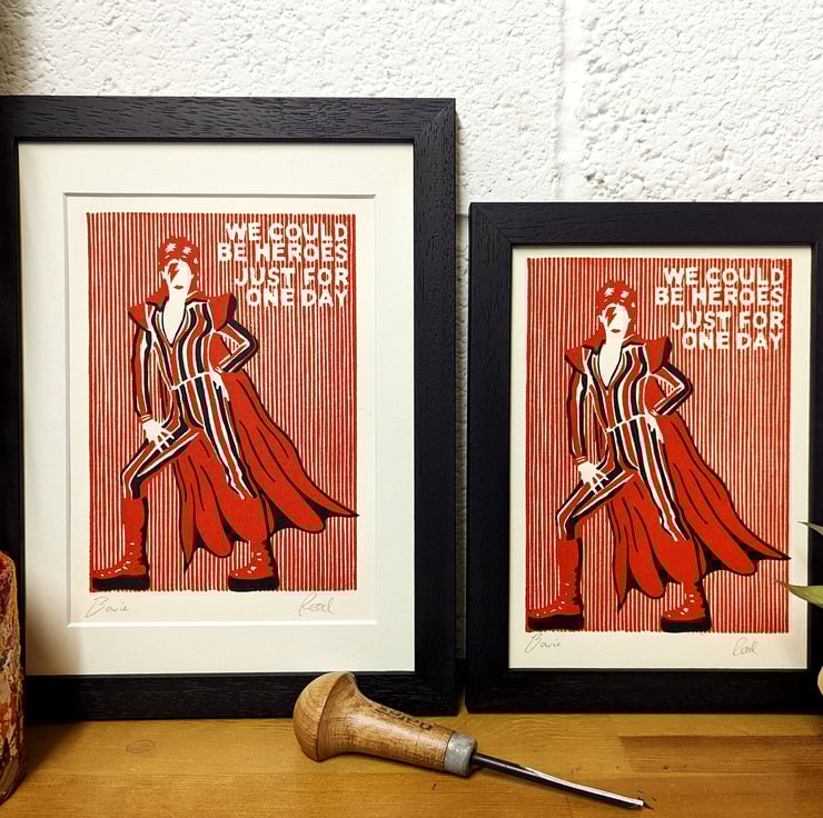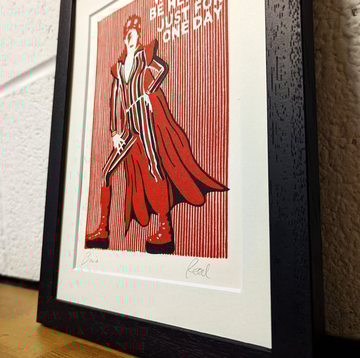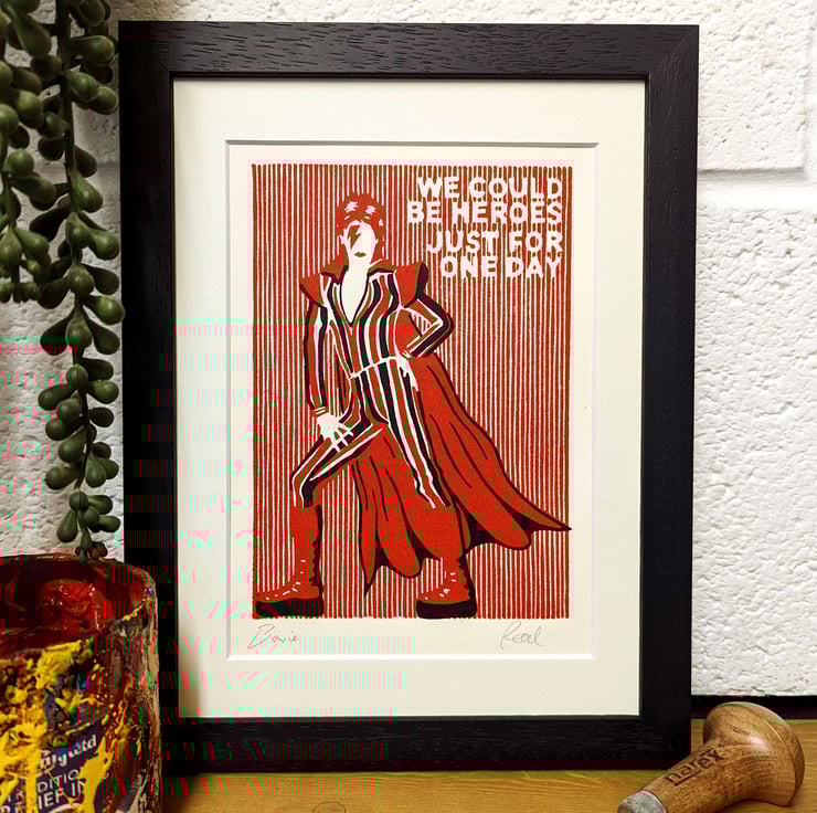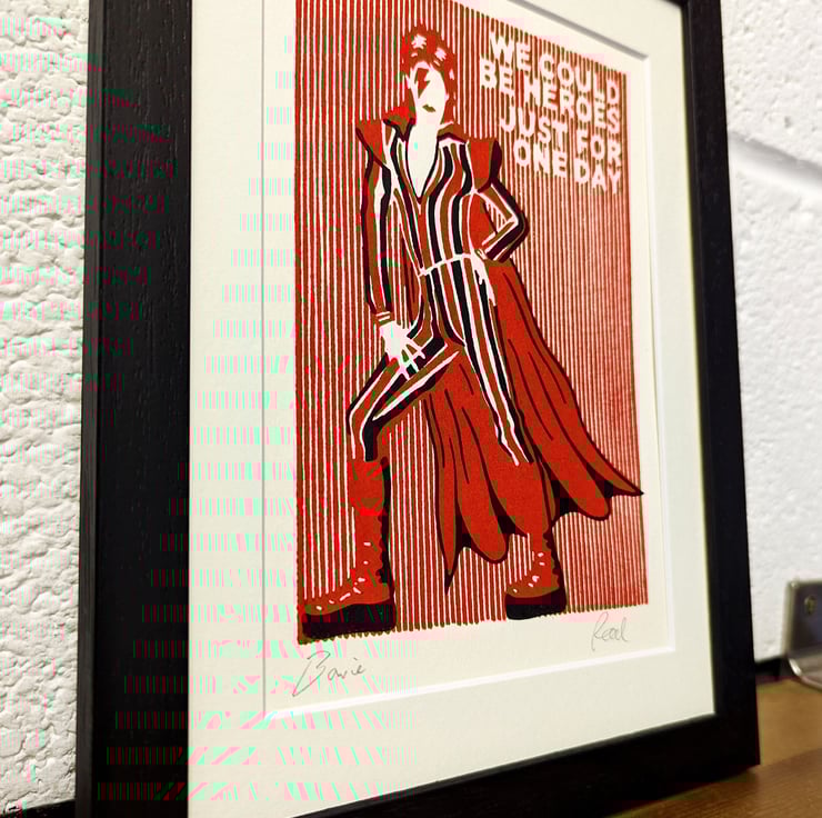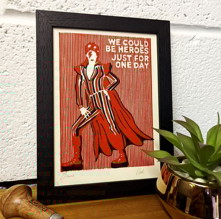 Original handmade print taking one of his iconic photo shoots and playing with his lyrics to create a great new Bowie Print, because Bowie is a Hero!