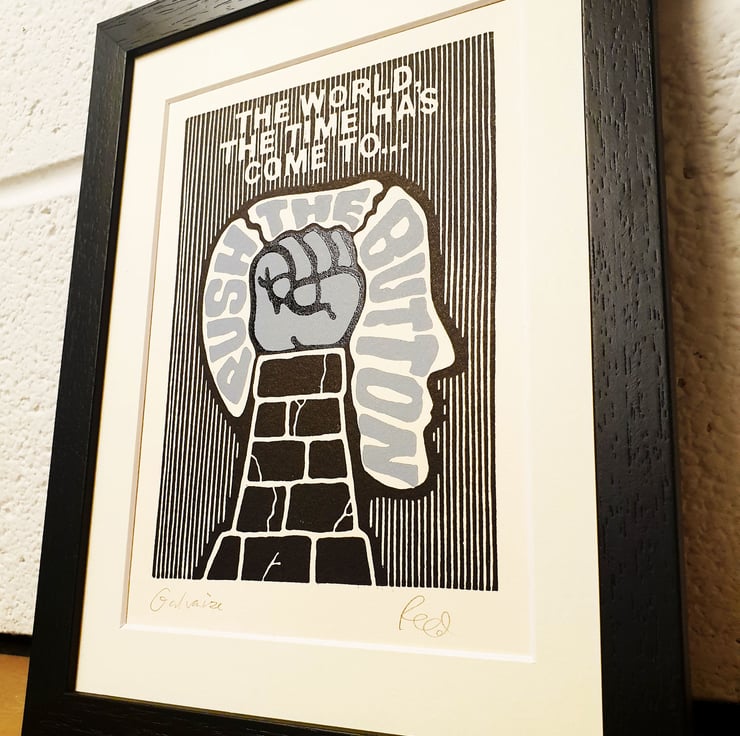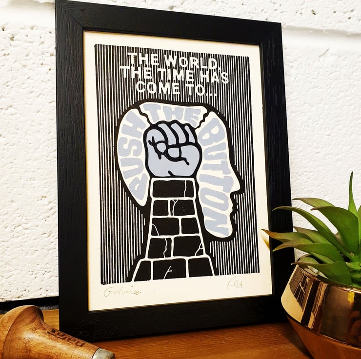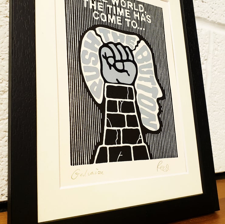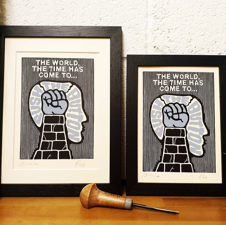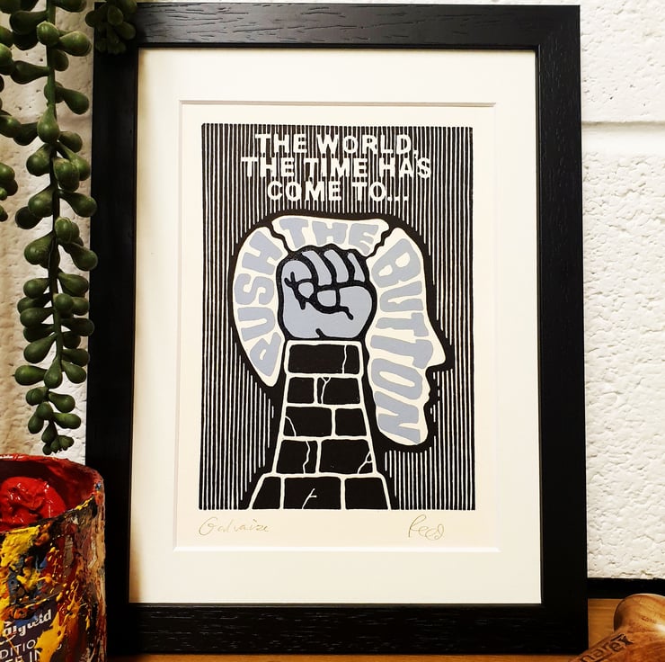Original handmade print using the album cover of 'Push the button' and mixing with the lyrics to 'Galvanize'