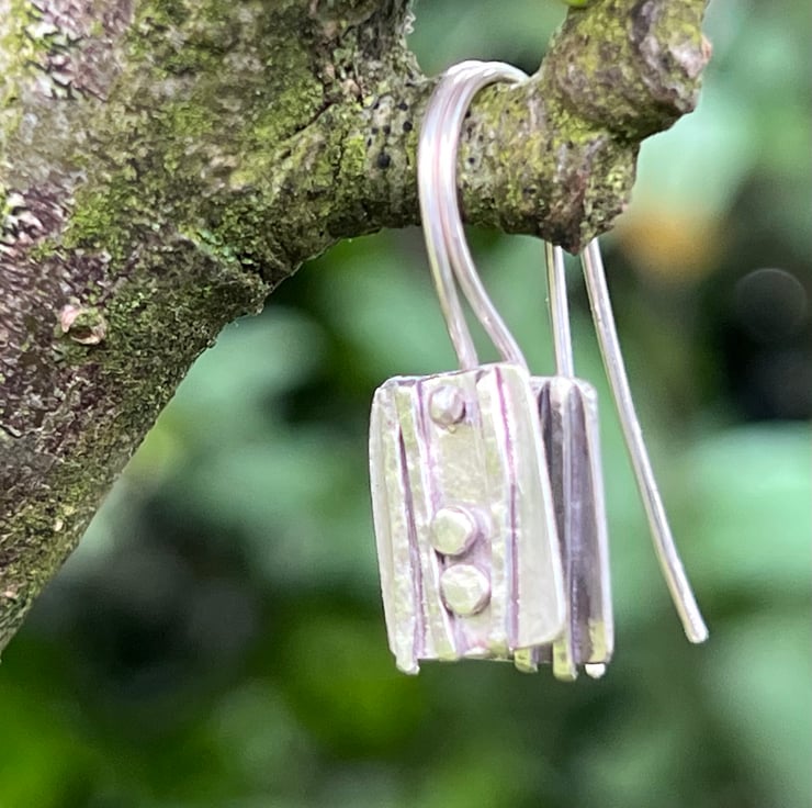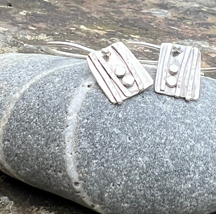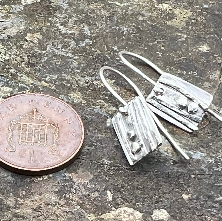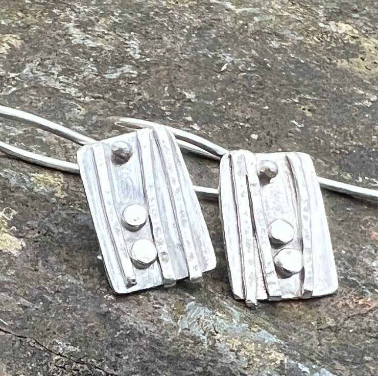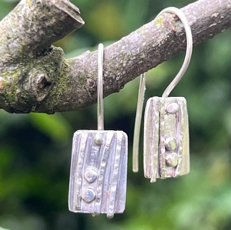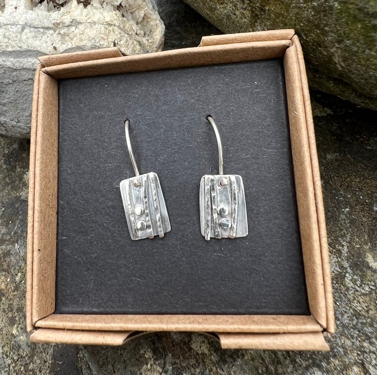 Sterling silver dangle earrings inspired by the strata and rock formations of the west Wales coast. They have textured decoration and are slightly different to each other. These are statement earrings that are light to wear and will be noticed.