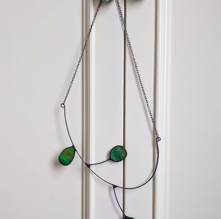 Stained glass demi-wreath made from Eucalyptus leaves in mid-green glass, created using the Tiffany copper foil technique.