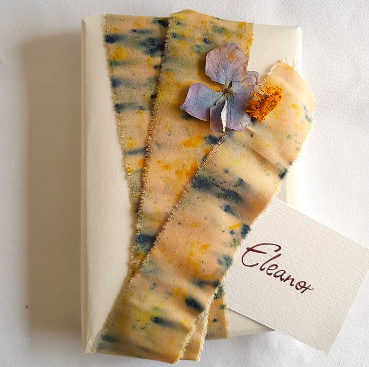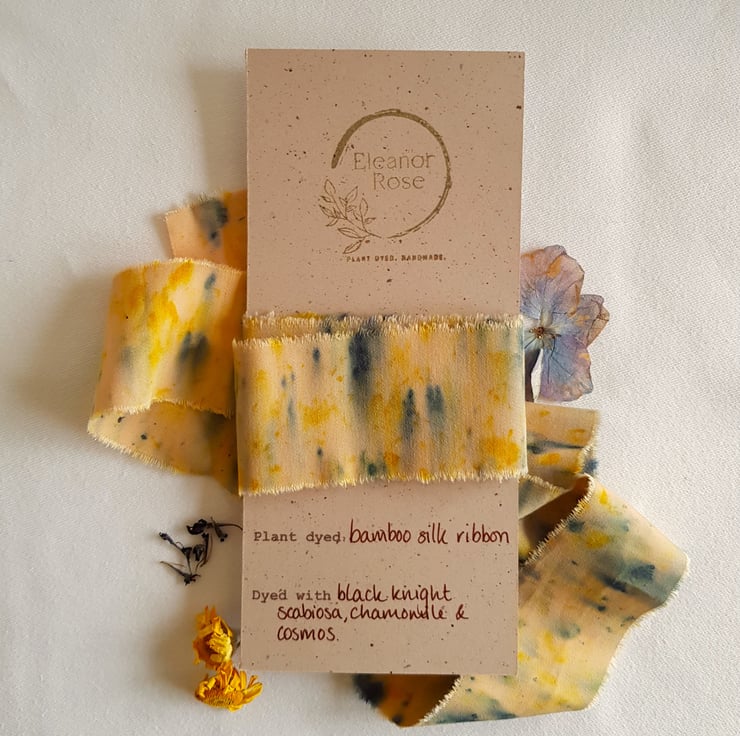 Luxurious, plant dyed and handmade ribbons made from organic bamboo silk, a beautiful vegan alternative to traditional silk. These ribbons are hand dyed with flowers, leaves, roots and even food waste in Surrey, UK. The botanical dye techniques mean that every ribbon is unique.