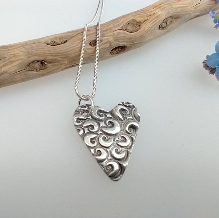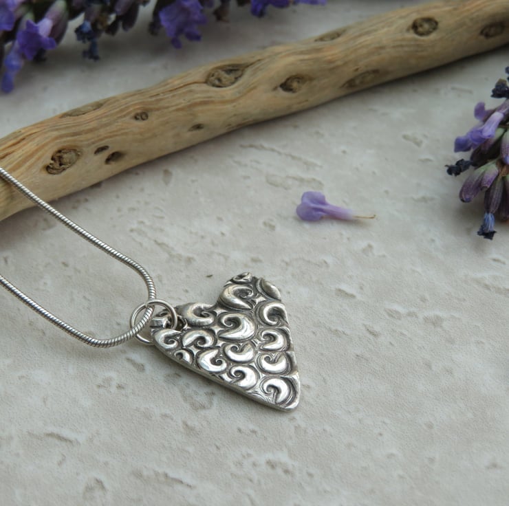 This is a sweet heart necklace made from fine silver, has a an oxidised shell texture on the front and is smooth and shiny on the reverse. The pendant is suspended from a sterling silver snake chain with two sizes from which to choose. Given to a loved one, this would make a very special and personal gift.