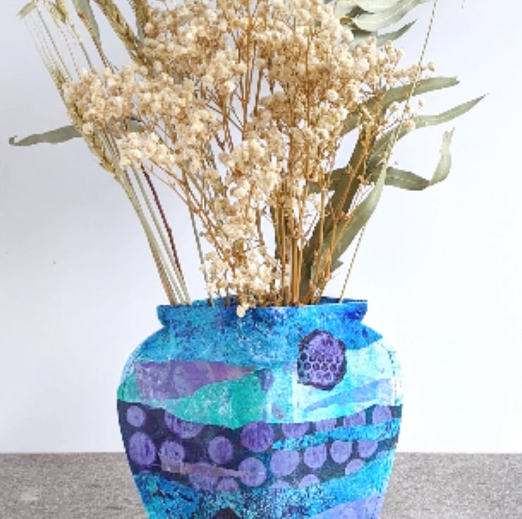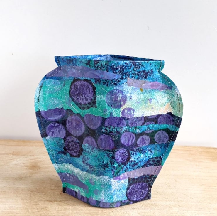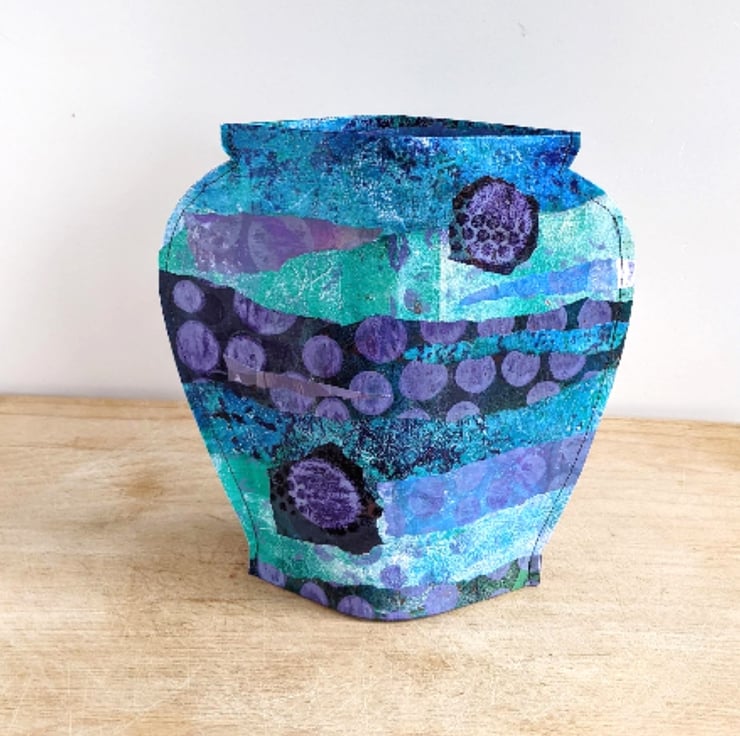 The vase is made from a collage of handprinted sheets made using acrylic paints on a gel plate, finished with an acrylic medium then sewn together to form the final shape.