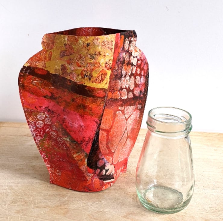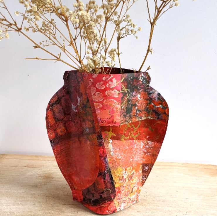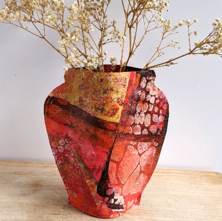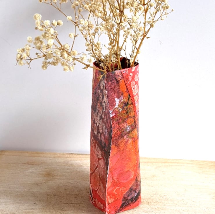 Unique paper vase cover in sumptuous reds, oranges and gold - just pop it over a glass jar or recycled tin can, and fill with fresh or dried flowers. It looks fabulous on it's own too! When you've finished using it, just flatten it for easy storage. A flat pack vase!!