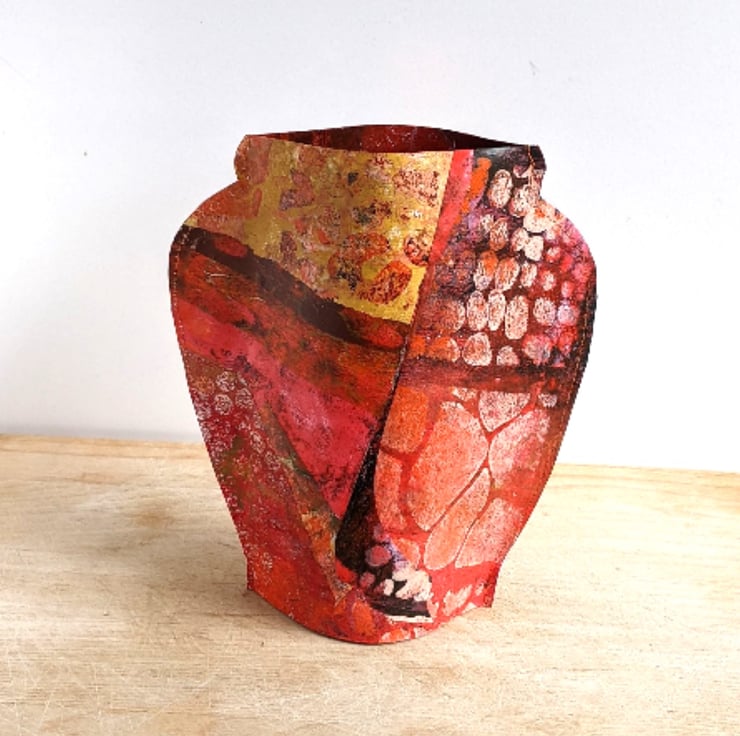 The vase is made from a collage of handprinted sheets made using acrylic plates on a gel plate, finished with an acrylic medium then sewn together to form the final shape.