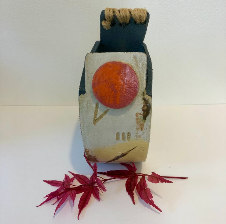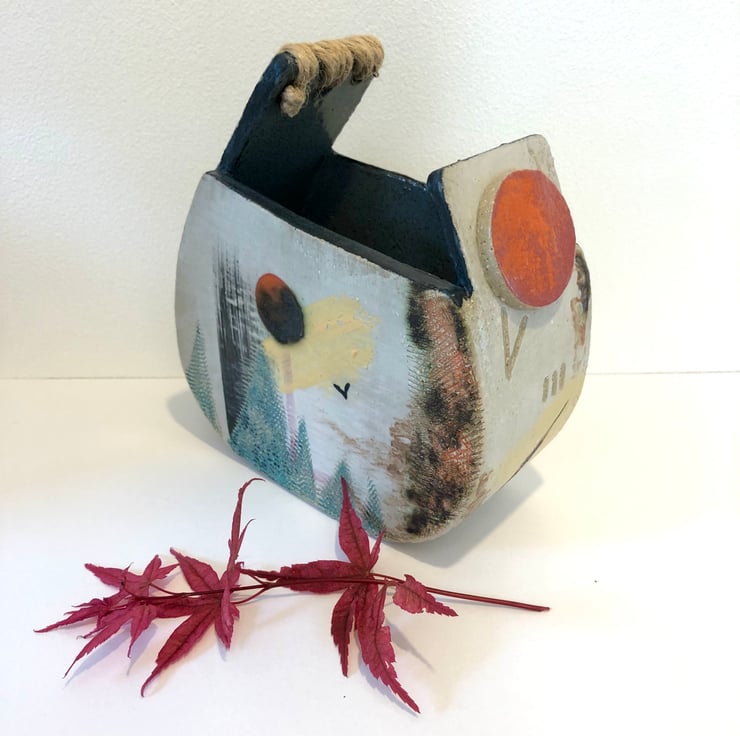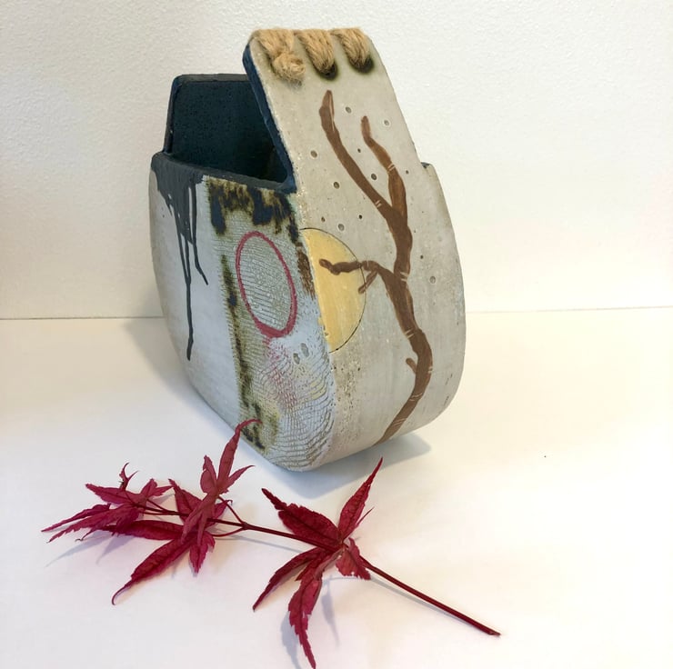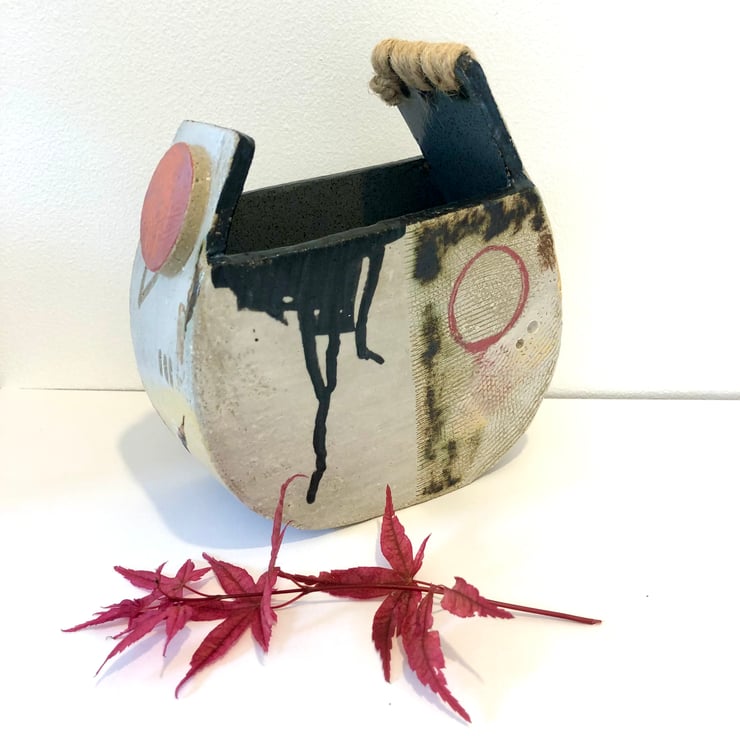 Decorated with coloured slips, twine, underglazes and incised marks this vessel is unique.