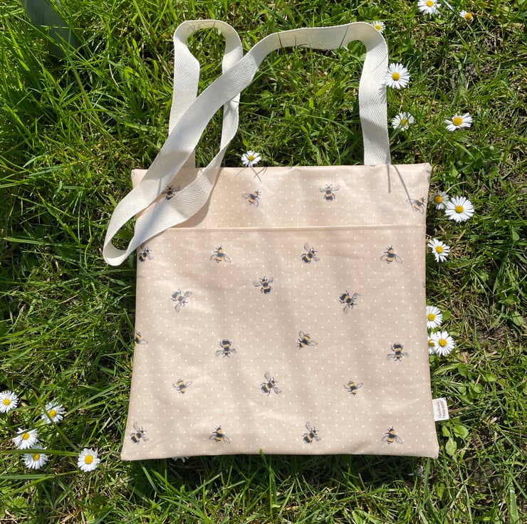 Cute Bumblebee print, over shoulder/ cross body peg bag. Pop this peg bag over your shoulder and peg your washing out with ease. This bag is made from Oil Cloth which it’s weather proof and wipe clean. Perfect for the sunny day. Pegs not included