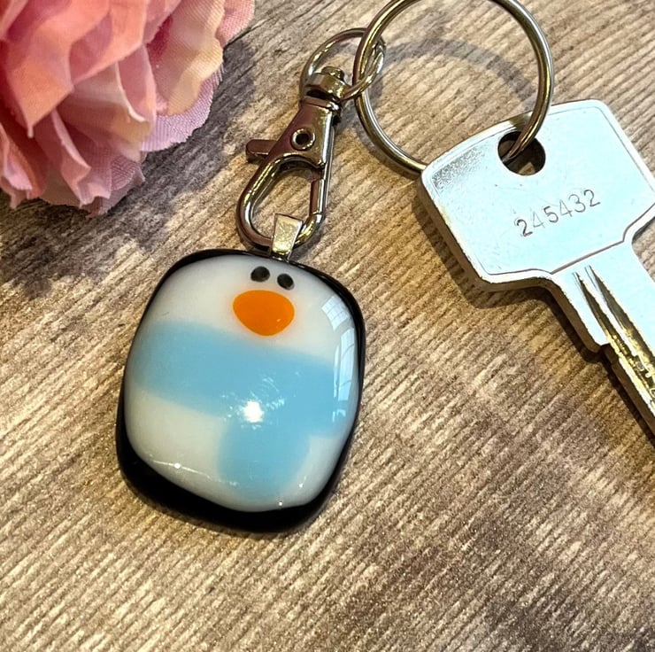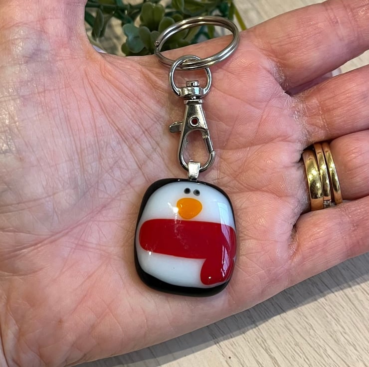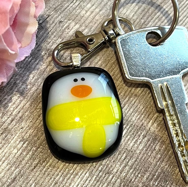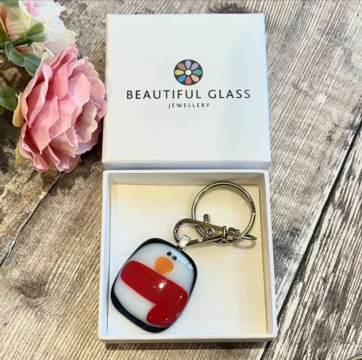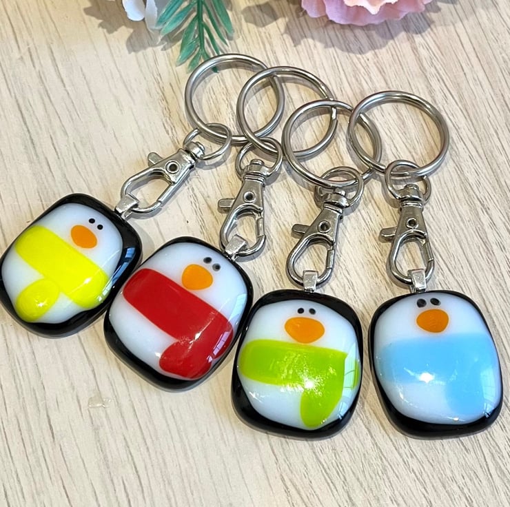Individually handmade by fusing tiny pieces of glass together, so each penguin is unique and may differ slightly from the photo. It comes on a split ring with a keyring trigger. Please select your favourite coloured scarf from red, yellow, blue or green.