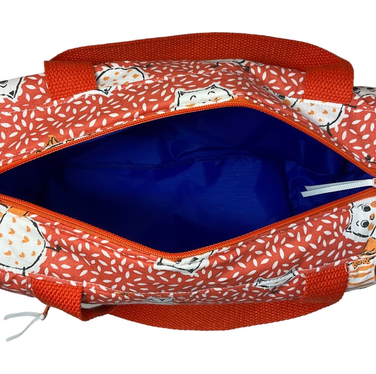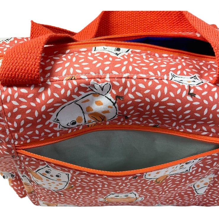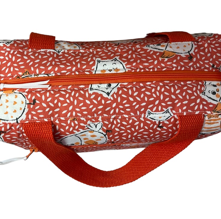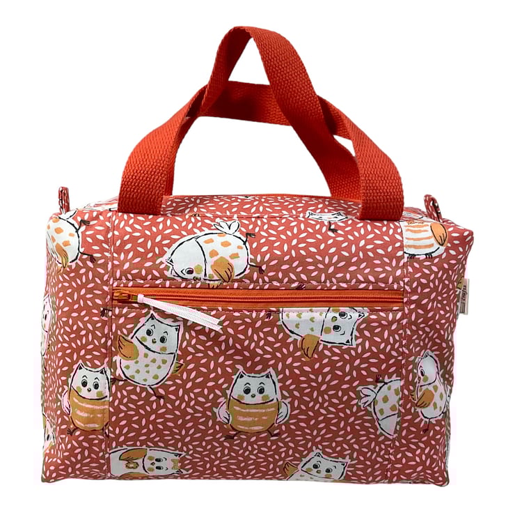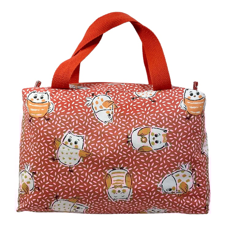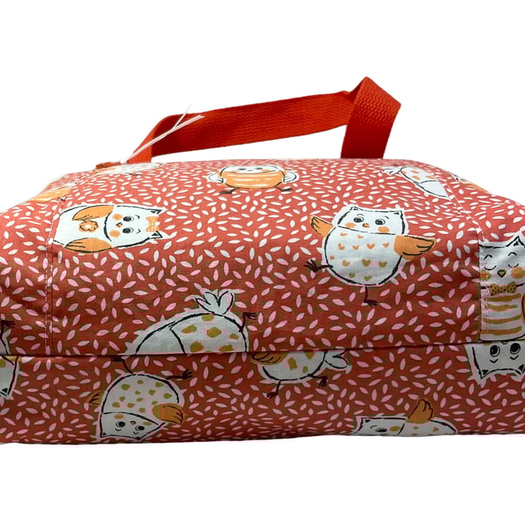 This large boxed bag is made from a cute owl print cotton on a burnt orange decorated background.