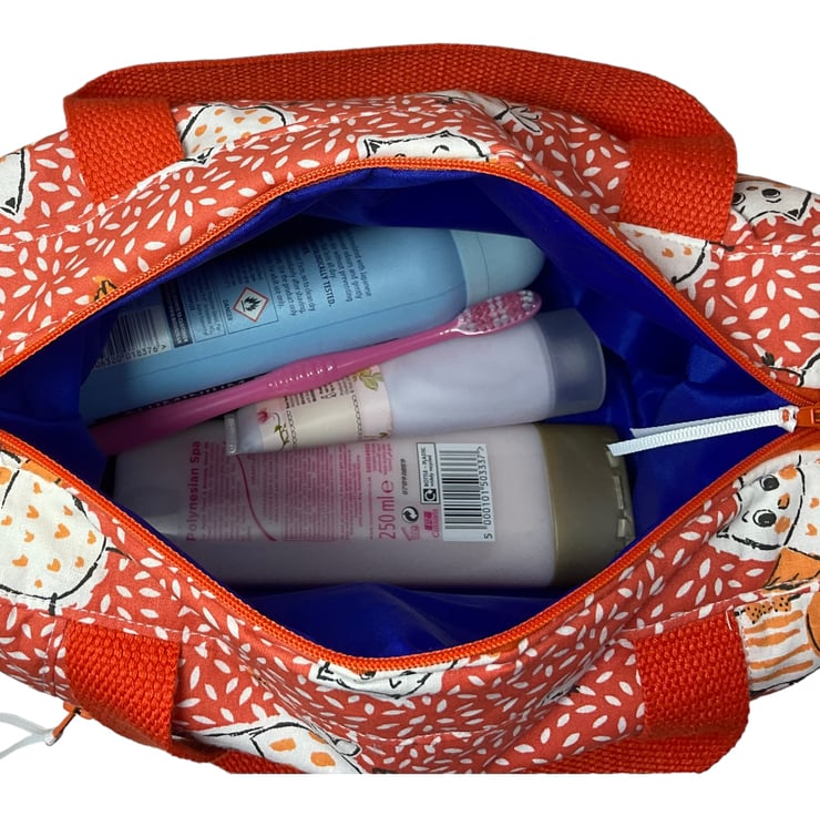 Large wash bag in owl print, toiletries bag with handles and pocket.