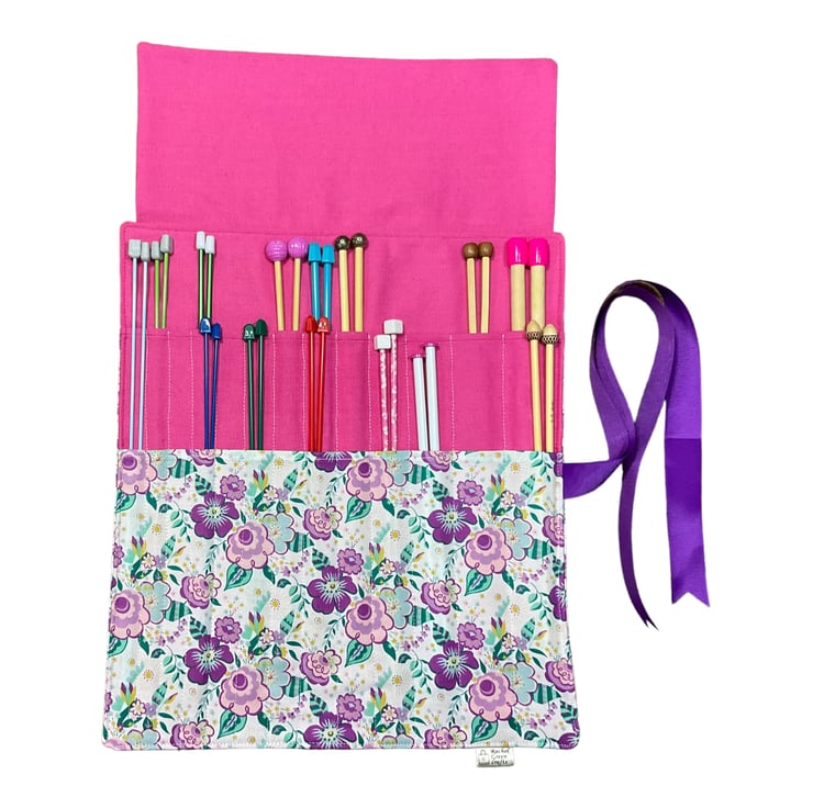 The case itself is interfaced for sturdiness and has 2 pockets, the lower pocket houses 13 sets of needles and above in the pink pocket is space for 13 more. There is a deep flap with matching fabrics and the entire case is topstitched for neatness. The case rolls up and is fastened by purple grosgrain ribbon. needles not included in sale. Pattern placement may vary.