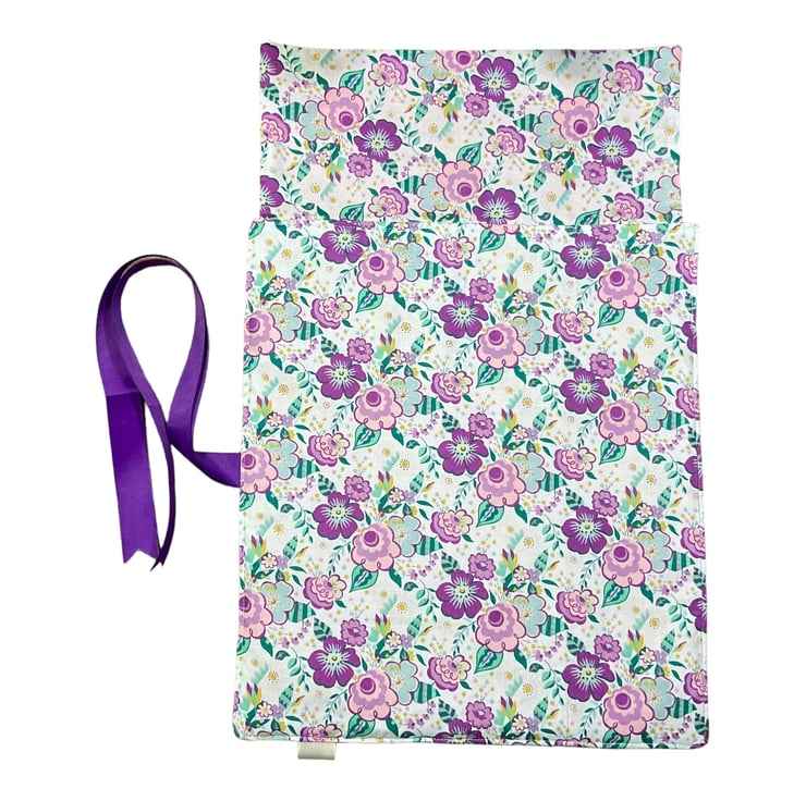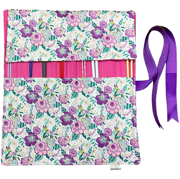 The case itself is interfaced for sturdiness and has 2 pockets, the lower pocket houses 13 sets of needles and above in the pink pocket is space for 13 more. There is a deep flap with matching fabrics and the entire case is topstitched for neatness. The case rolls up and is fastened by purple grosgrain ribbon. needles not included in sale. Pattern placement may vary.