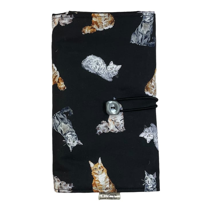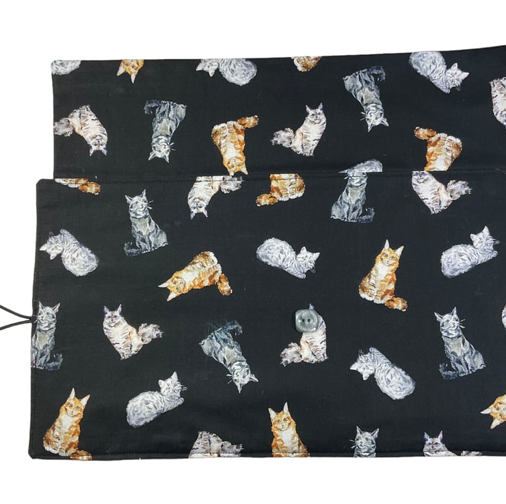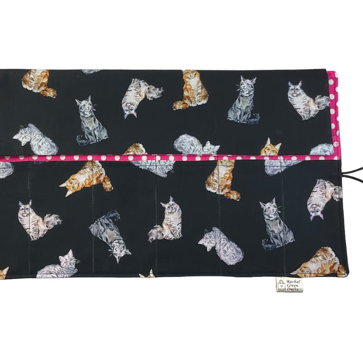 I have used a realistic cat print fabric on a black background for the outer, outside of flap and lower pocket and a heavyweight cerise pink with white spot canvas cotton to line the case and the upper needle pocket. The case is interfaced for structure and strength and topstitched all around for neatness.