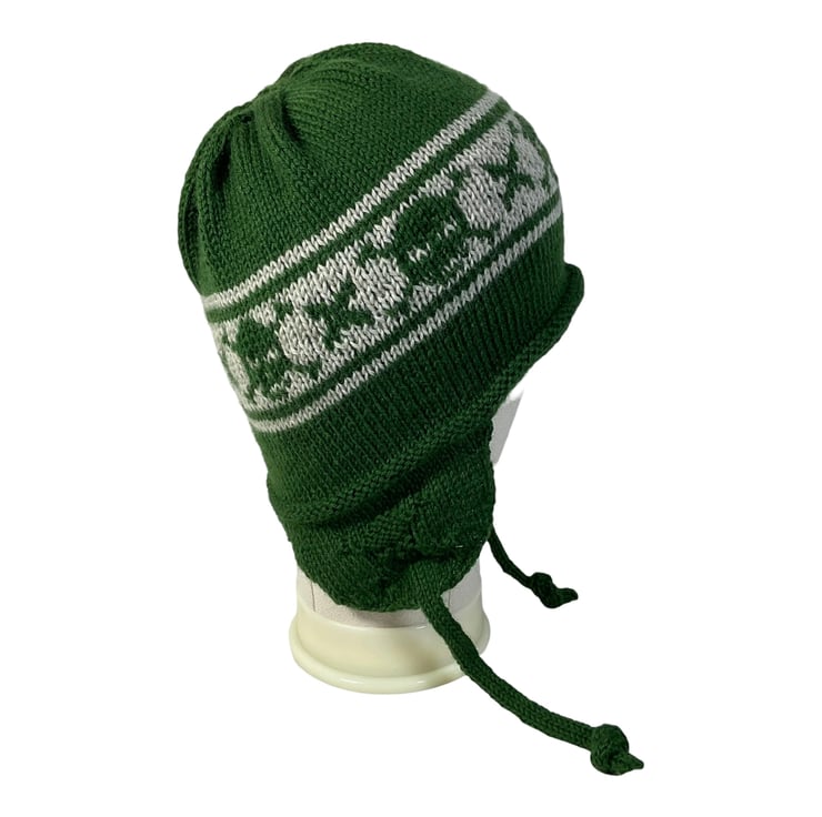 The flaps are a decent size to completely cover your ears and the hat ties with 2 substantial corded ties in green, the flaps have a reverse stitch skull on each to assist with them laying flat.