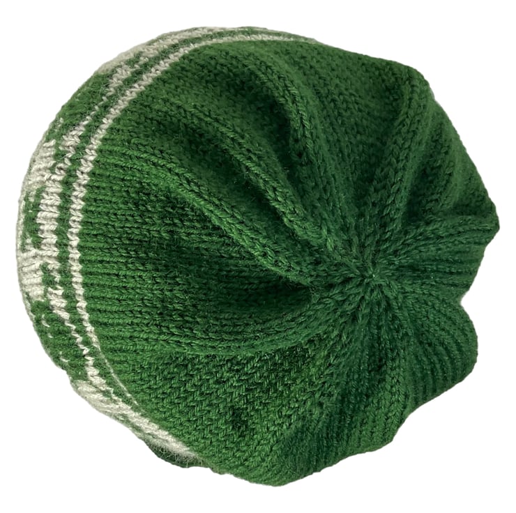This is made of pure merino wool, so lovely and warm.The main shade is a bottle / British racing green and the contrast is a silver grey. The stranded pattern is in a band around the centre of the hat.