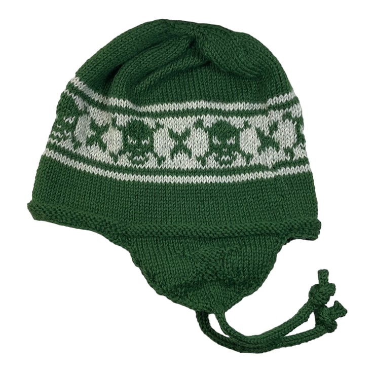 A lovely warm ear flap hat, with a skull motif stranded in the knit.