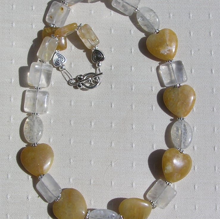This Stunning Necklace is made from Golden Jade Heart beads alternated with pale Yellow Tourmaline puffy oval Beads and pale Lemon Quartz Square Beads each separated by a tiny Tibetan Silver Flower spacer bead - a soothing yet striking combination that will look stunning either worn casually or with something more Elegant for a Special Evening out
