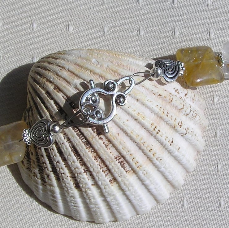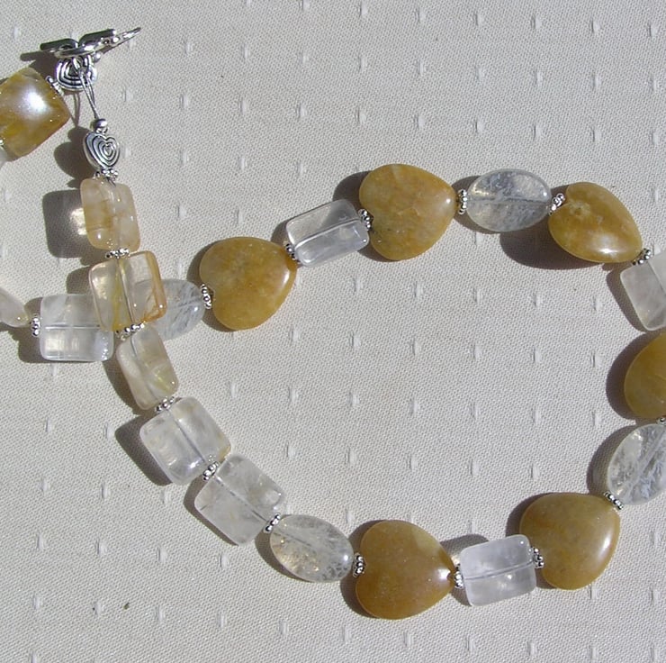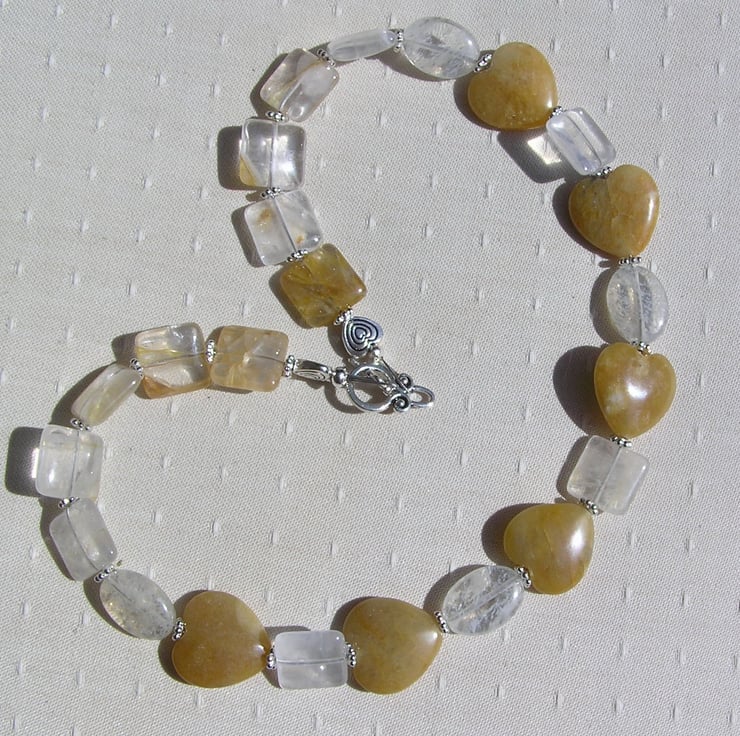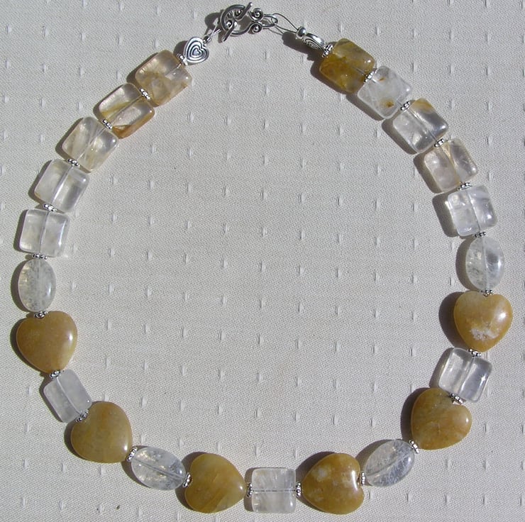 This Stunning Necklace is made from Golden Jade Heart beads alternated with pale Yellow Tourmaline puffy oval Beads and pale Lemon Quartz Square Beads each separated by a tiny Tibetan Silver Flower spacer bead - a soothing yet striking combination that will look stunning either worn casually or with something more Elegant for a Special Evening out