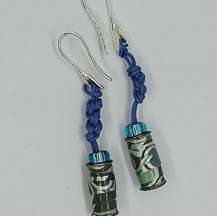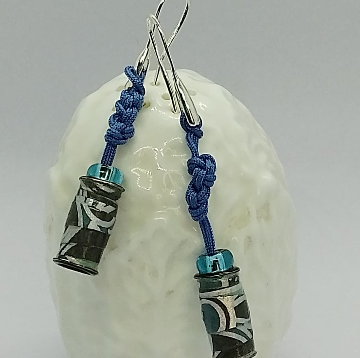 Handmade black and blue paper beads with enamel eyelets on cord chain with silver plated hooks. 6cm long overall.