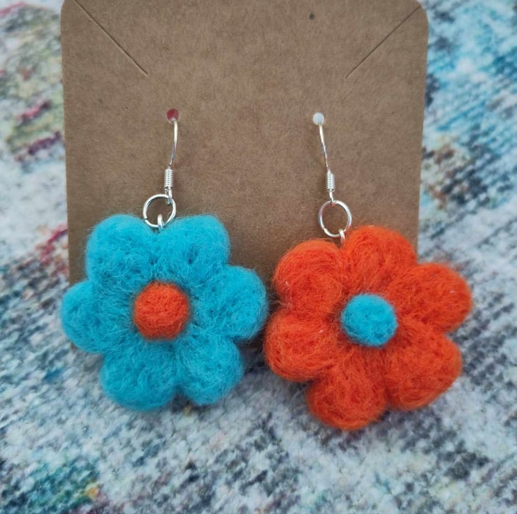 Unique and lightweight needle-felted earrings resembling flowers in orange and blue.