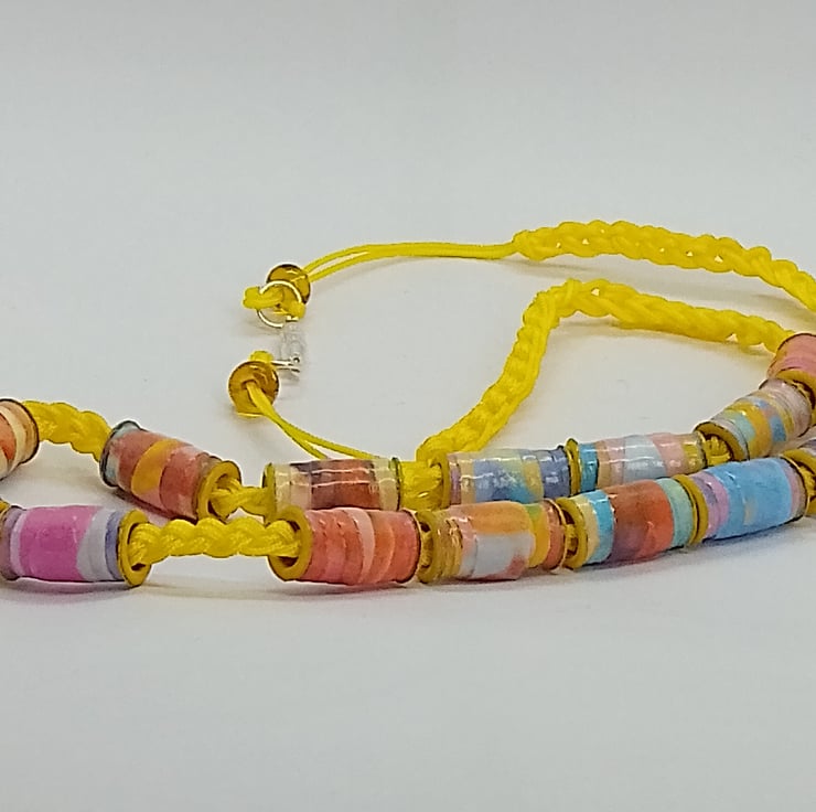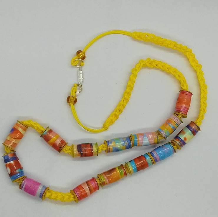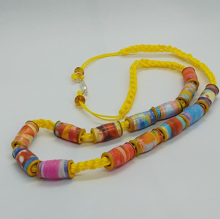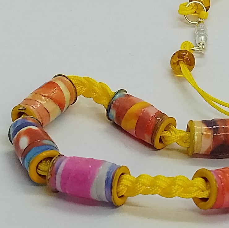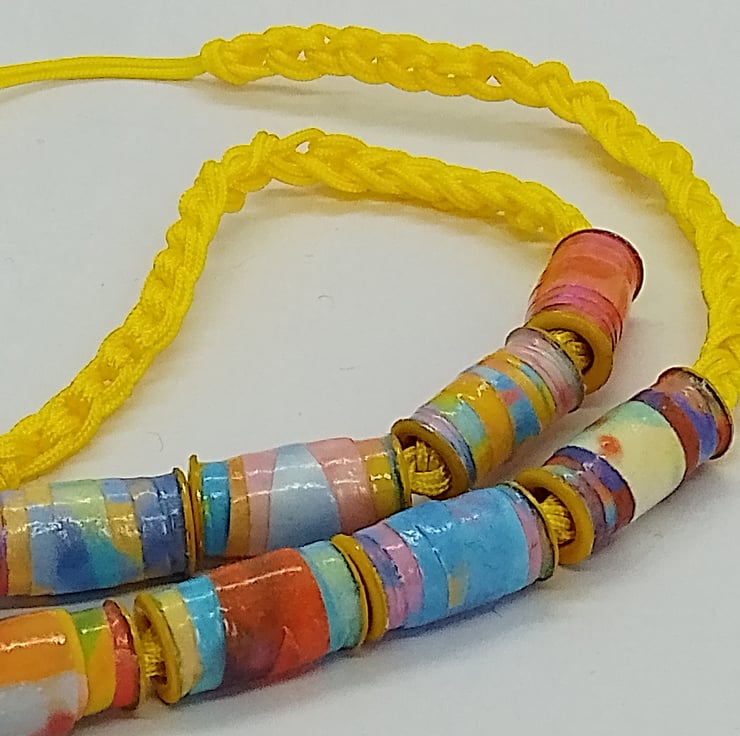 Handmade paper beads in shades of pink, blue, peach and yellow with enamel eyelets, on bright yellow cord chain with a screw barrel clasp.