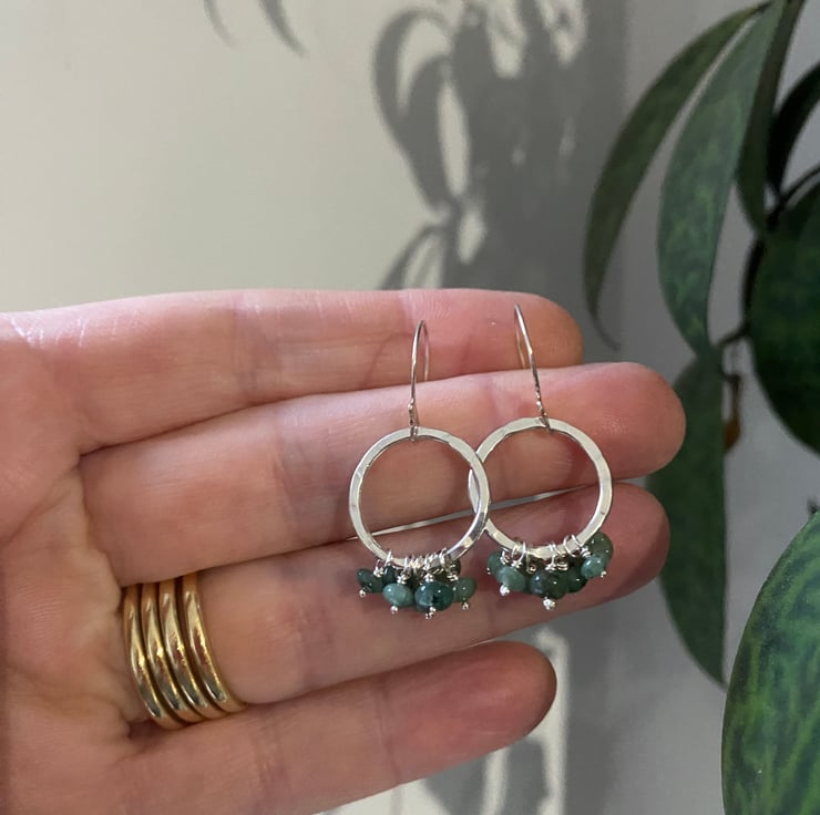 Super Disco Ruffle earrings. Each with 7 emerald gemstones daintily strung onto a handmade silver disco circle with sterling silver wires. Larger than our original disco ruffle earrings.