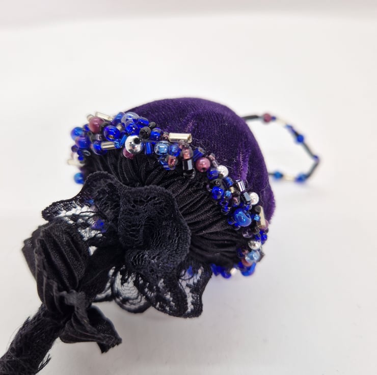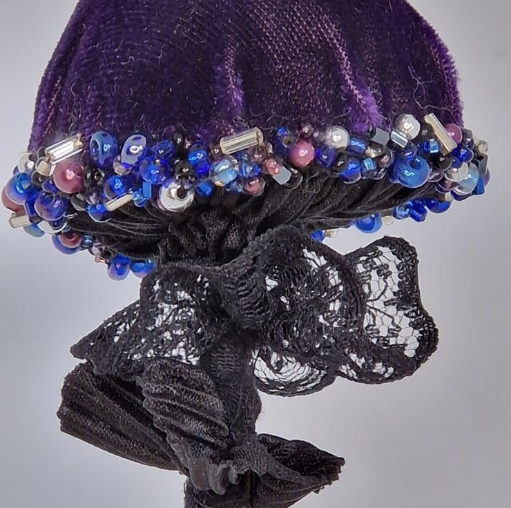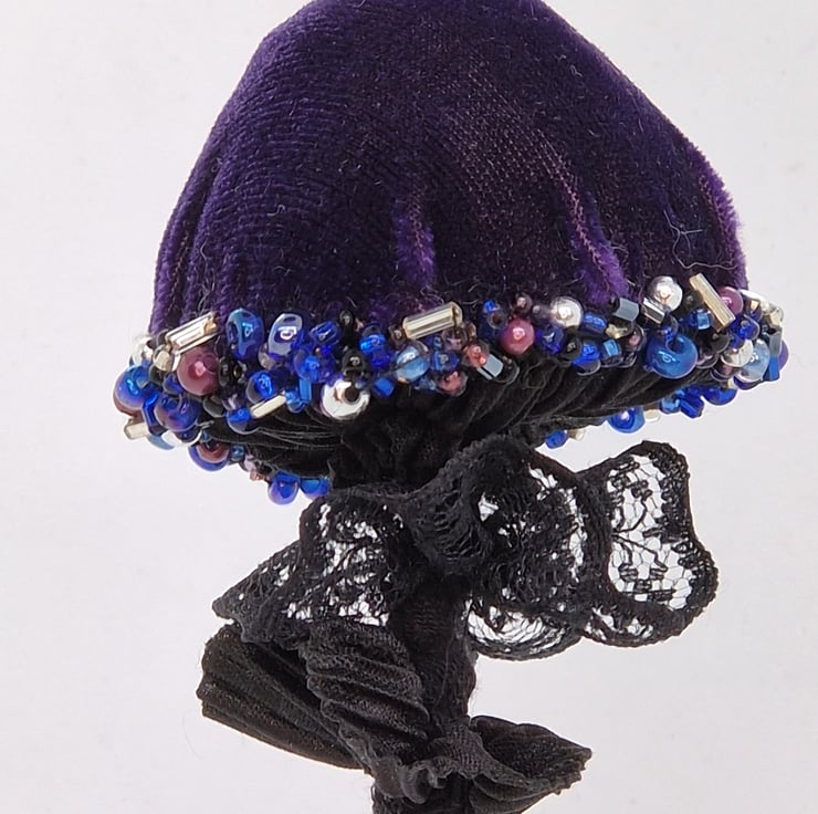 Hand crafted velour velvet mushroom in beautiful purple with black gills, black lace and a black stalk made from recycled fabric. The plush cap is adorned with individually hand sewn beads and has a loop for hanging in the same beads. Each mushroom is unique and is made from my own patterns and designs.