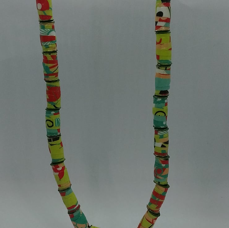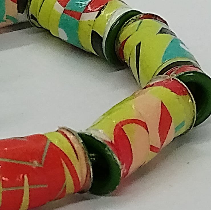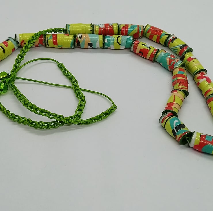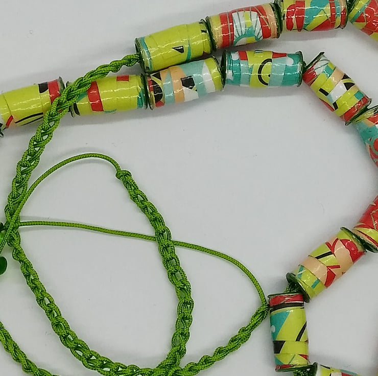 Green handmade paper beads with enamel eyelets on a cord chain with a claw clasp.