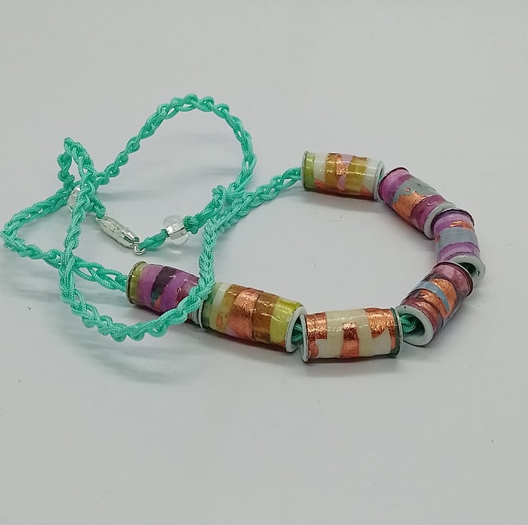 Handmade paper beads in shades of turquoise, pink and rose gold with enamel eyelets on a cord chain with a screw barrel clasp.