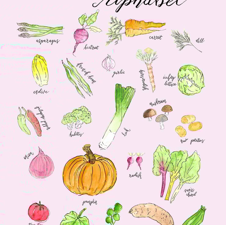 An Illustrated Vegetable Alphabet - Eco Wall Art (A4) - Watercolour on Pink