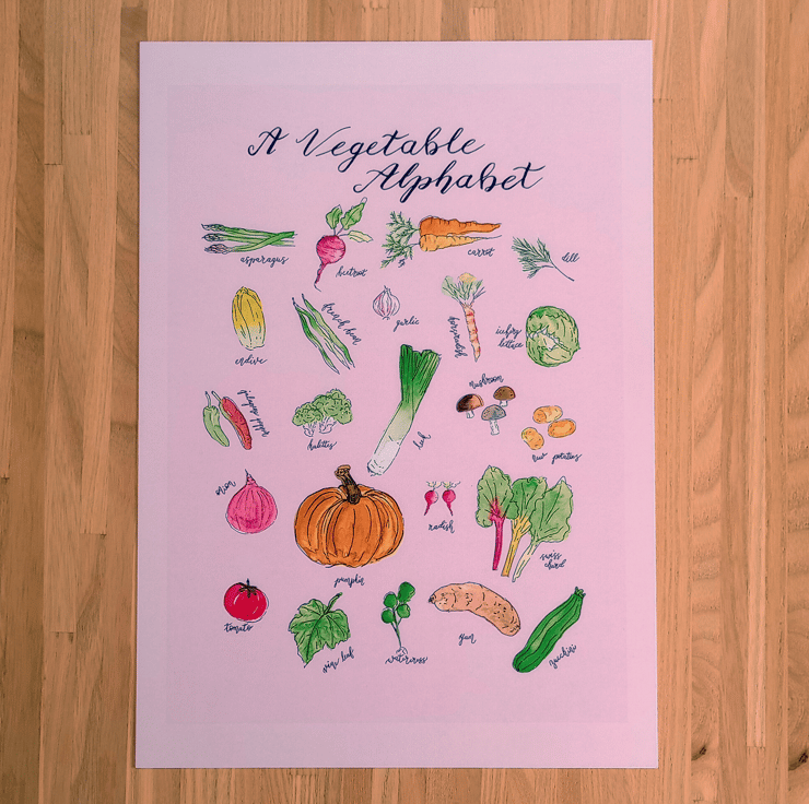 A tasty way of learning your ABC's, this A4-sized art print features 23 loose, watercolour veggies with pen detailing and hand-written name labels. Ideal as a kitchen print, to brighten a child's room or bring a bit of fun to your living space.