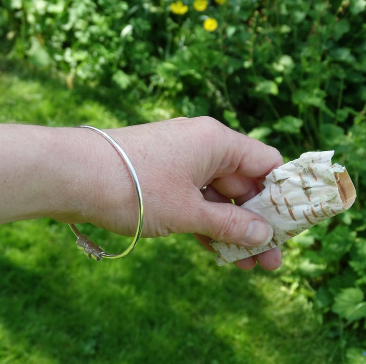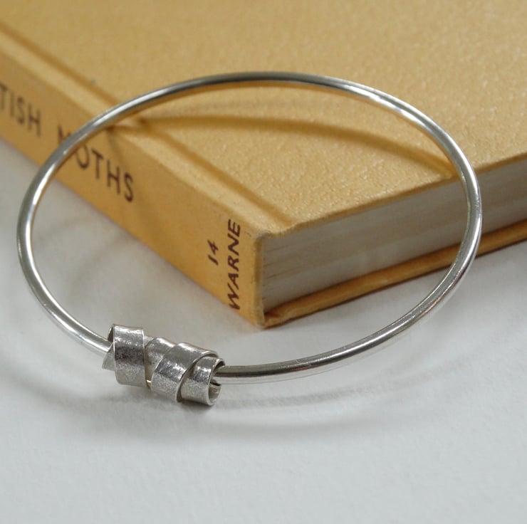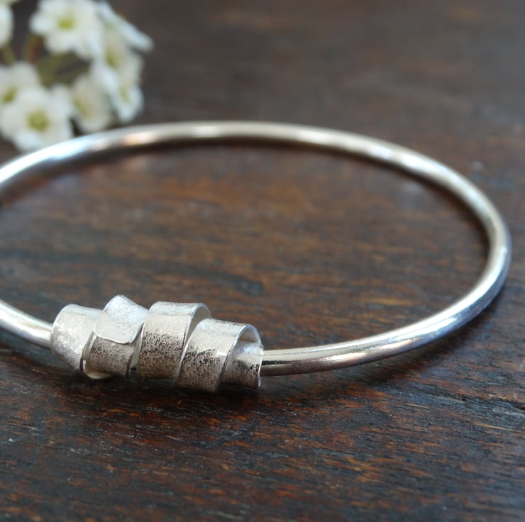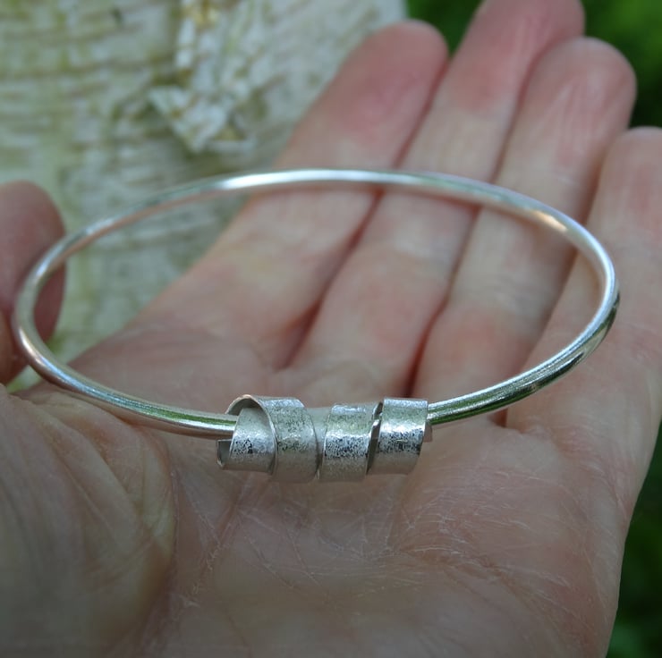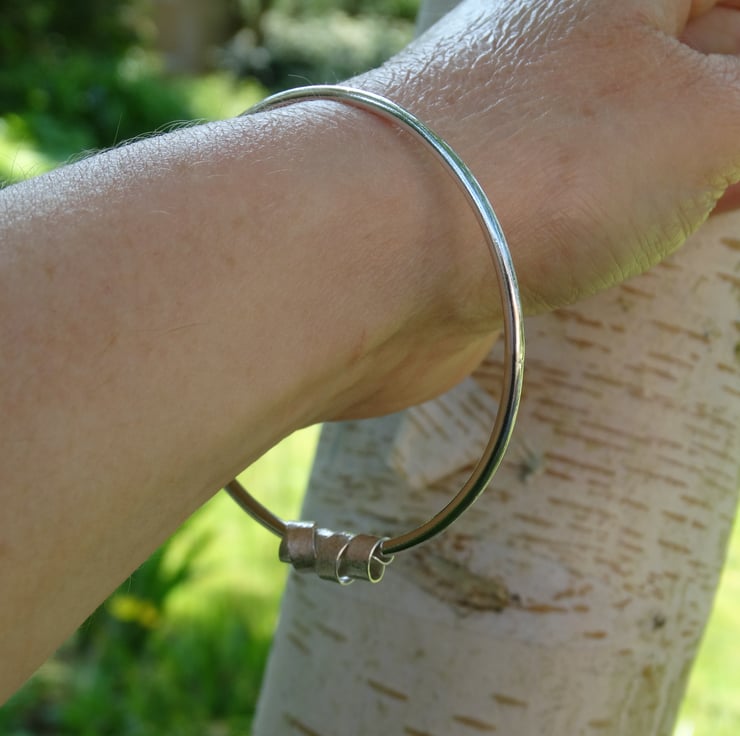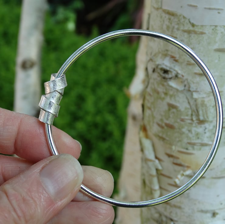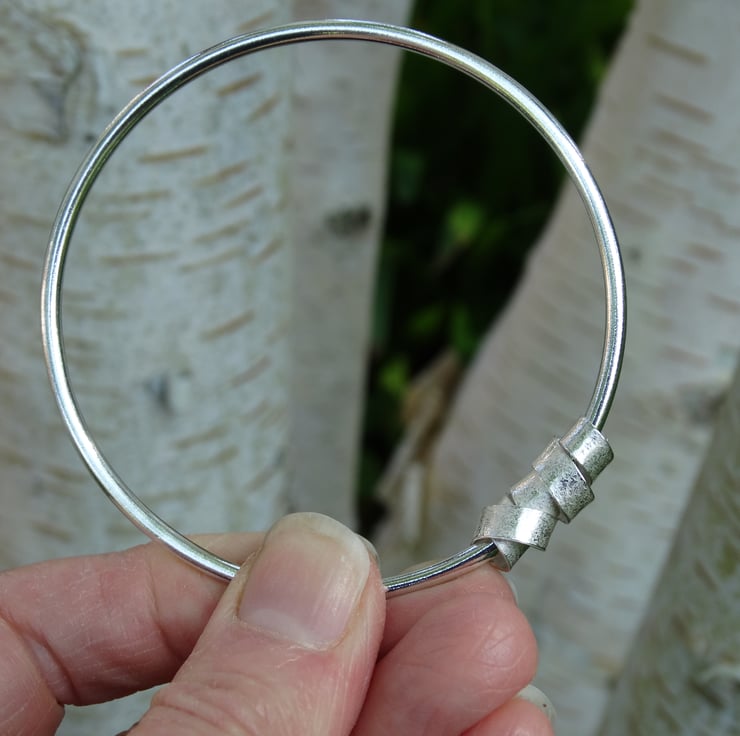 A lovely contemporary silver bangle featuring one of my birch bark scrolls. Each scroll is individual - made by texturing a length of recycled sterling silver with a hammer, then curling it to resemble strips of bark. No two are ever exactly the same.