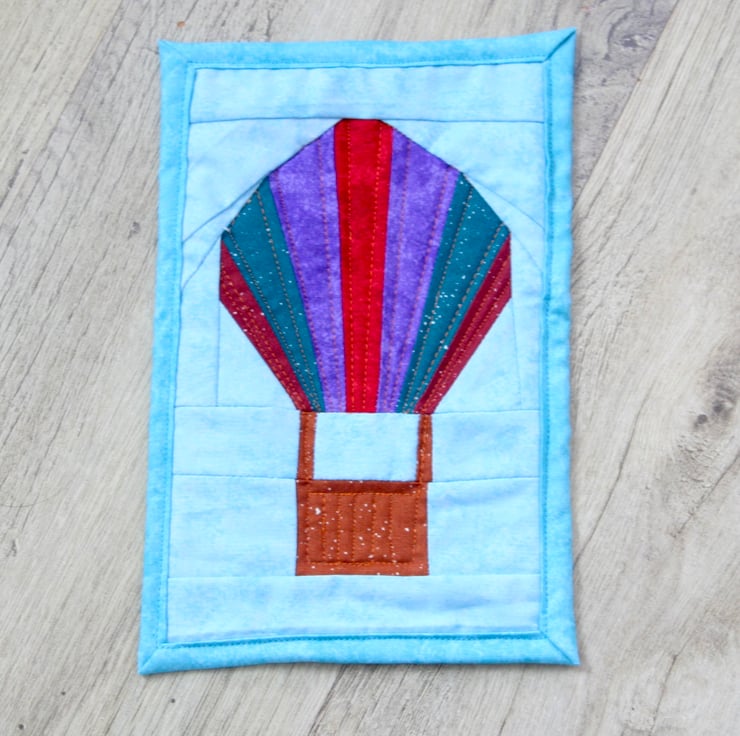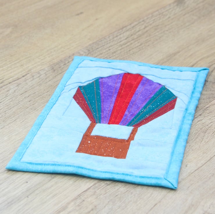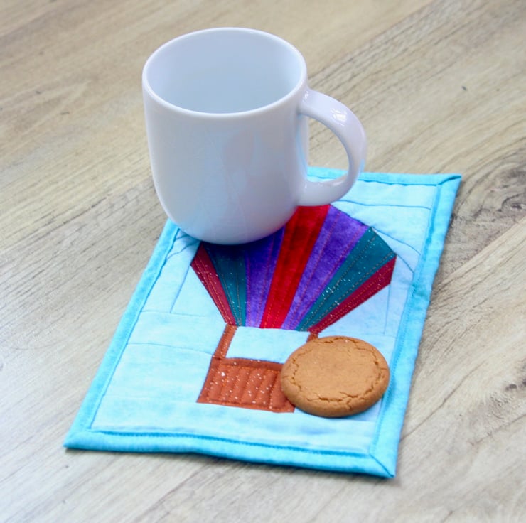 This beautiful mug rug, featuring a patchwork Hot Air Balloon with wicker basket, is the perfect size for your cuppa and a cheeky biscuit.