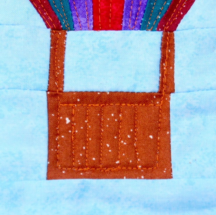 The front has a blue background with the patchwork balloon made from burgundy, green, purple and red fabric. The basket is a light brown fabric.