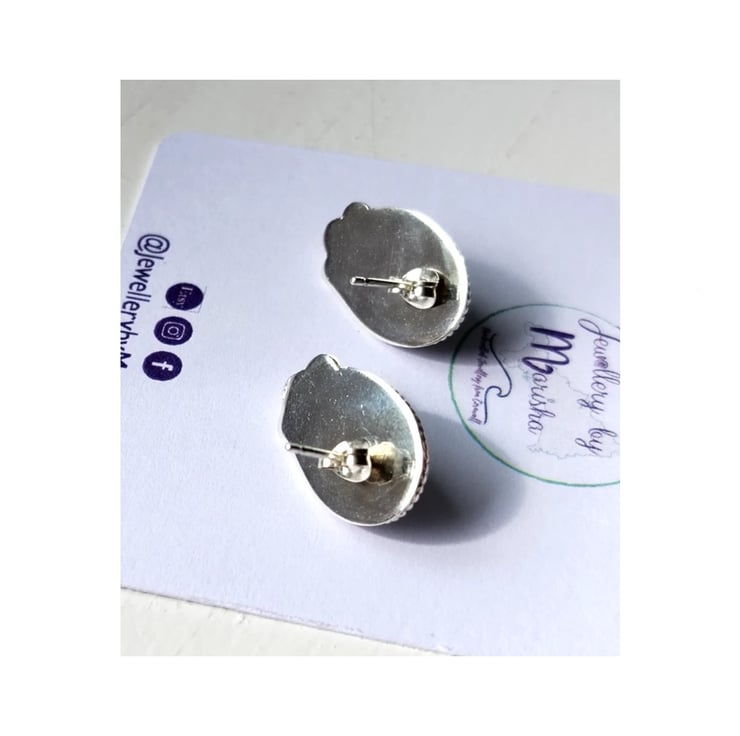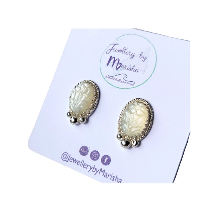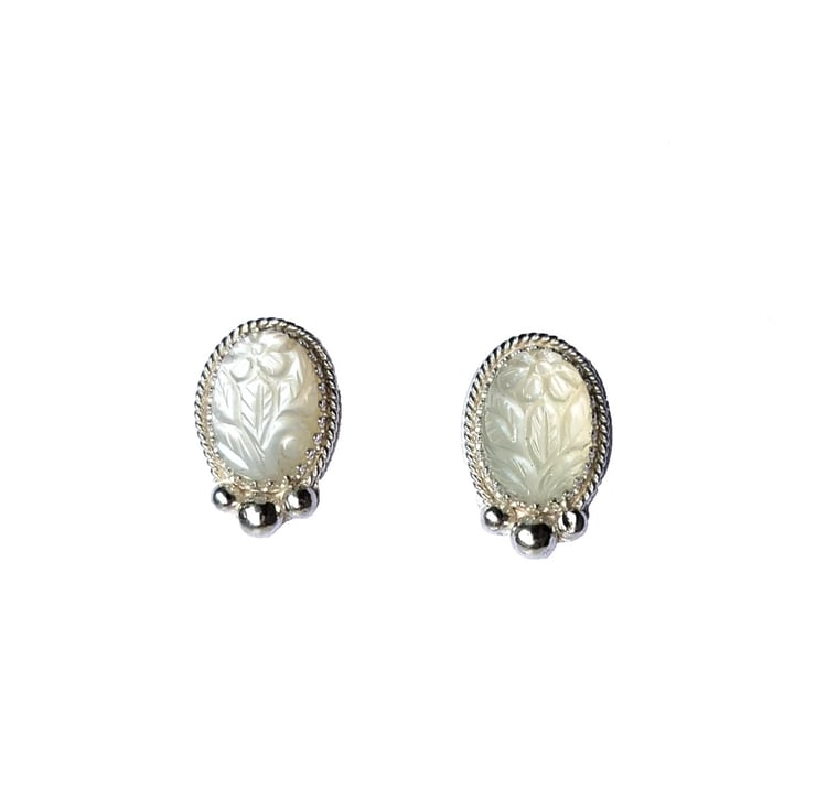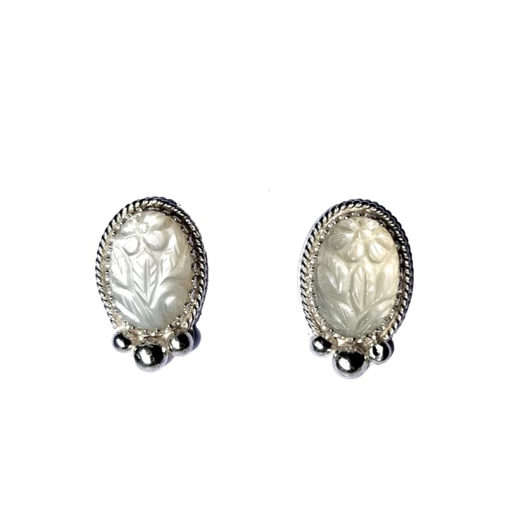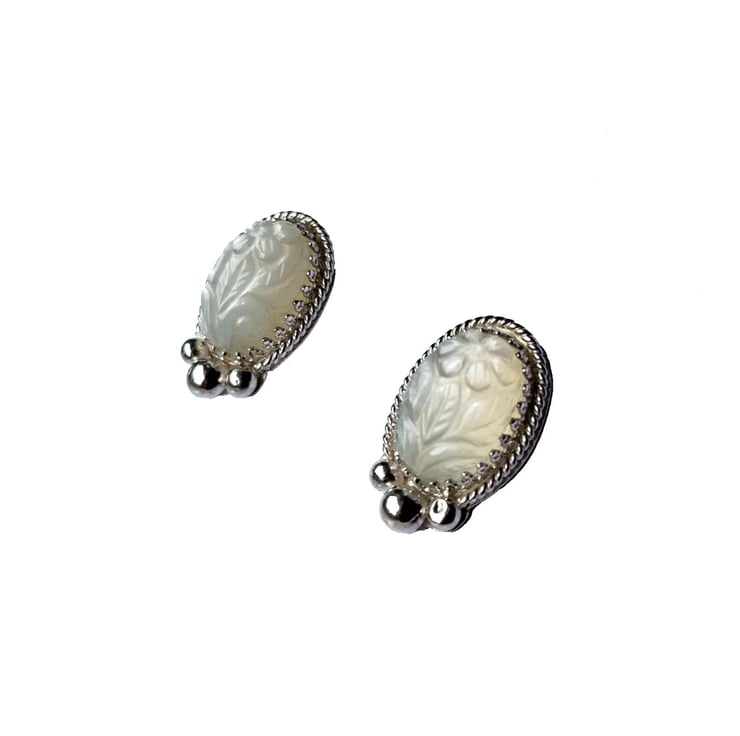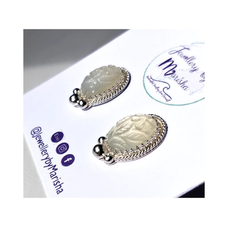 Sterling Silver 925 Handcrafted Stud Earrings with beautiful mughal hand carved floral white moonstones