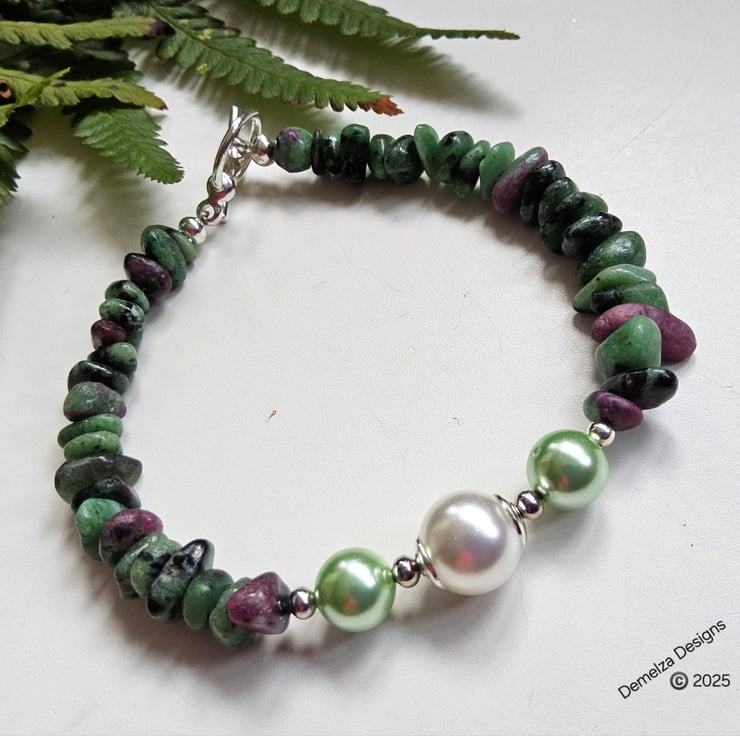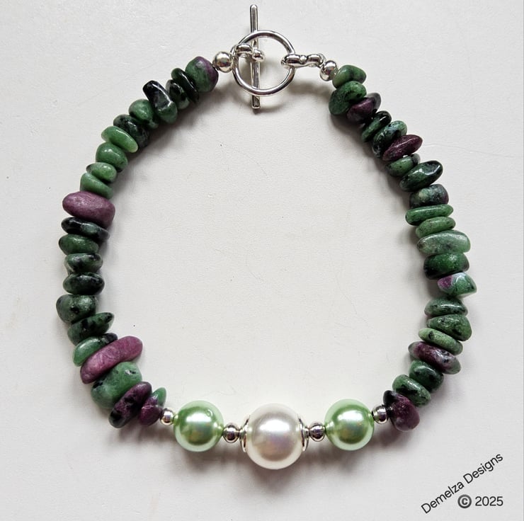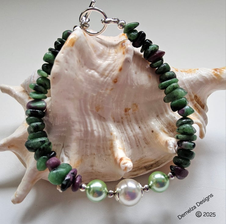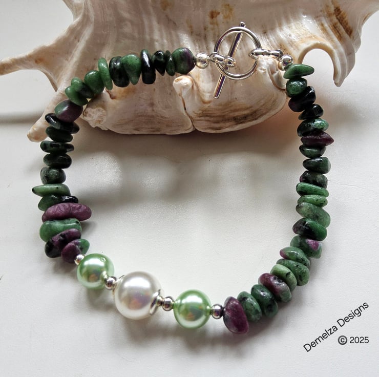 This lovely ruby zoisite bracelet has been designed and hand crafted in Cornwall using genuine tumbled medium nuggets complimented with shell pearls.