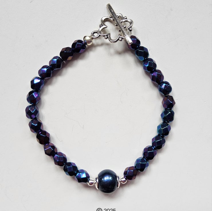 This gorgeous sparkling bracelet has been designed and hand crafted in Cornwall using blue metallic faceted quality 6mm crystal beads complimented with a genuine royal blue freshwater culture pearl. The toggle clasp is a large tibetan silver flower shape.