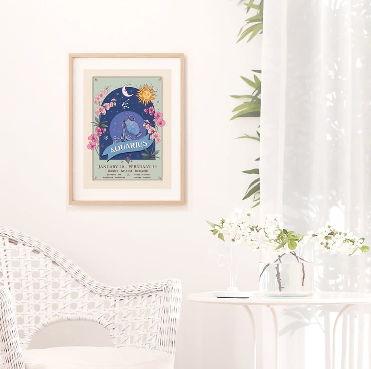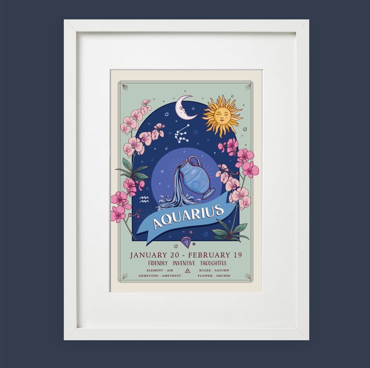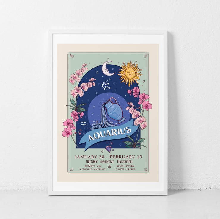 An unframed wall art print from my original illustration. Part of my 'Zodiac Signs and Flowers' collection it has lots of information about each star sign.