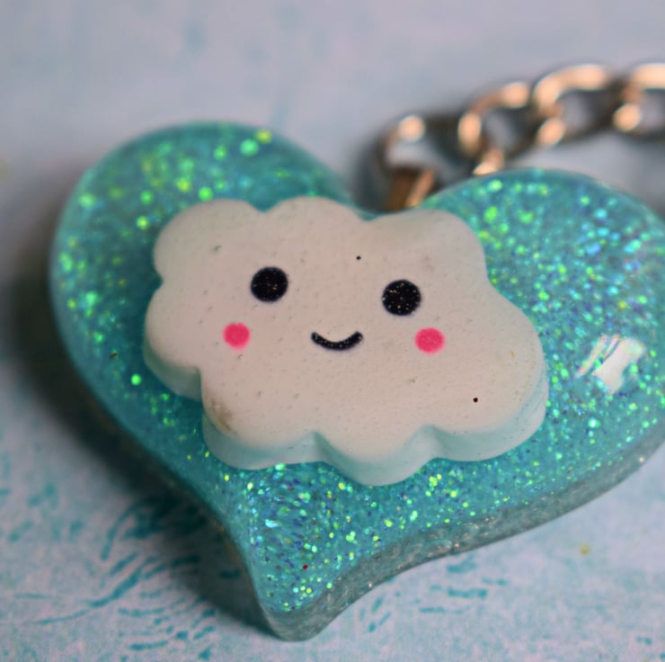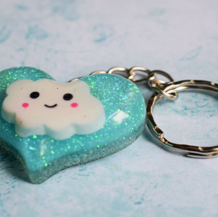 This heart shaped resin pendant has been embedded with a smiling cloud and then backed with pale blue iridescent glitter. A sturdy silverplated keyring fitting ash then been attched so it's ready to use!