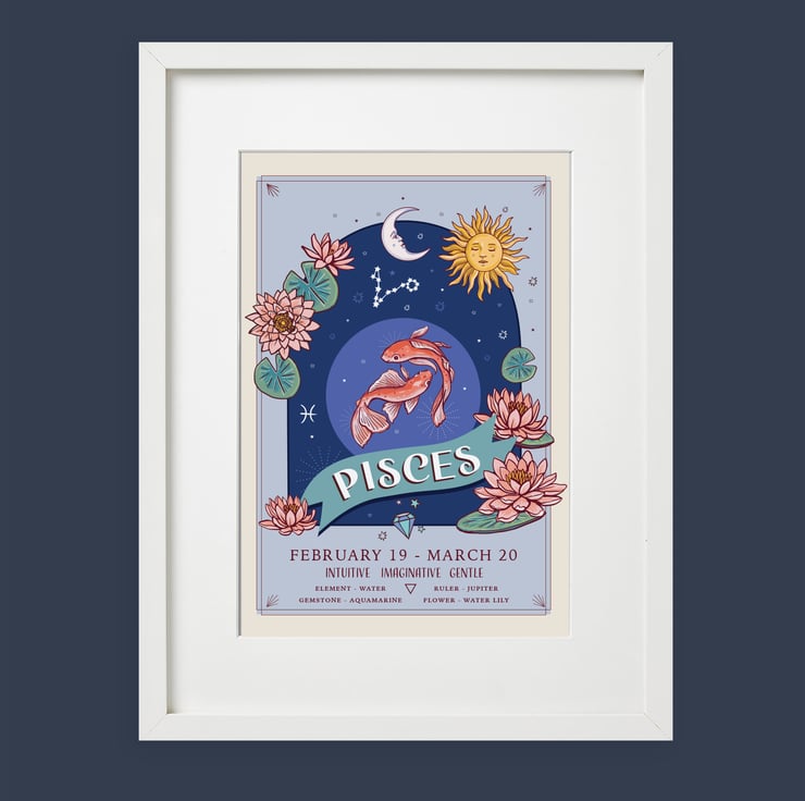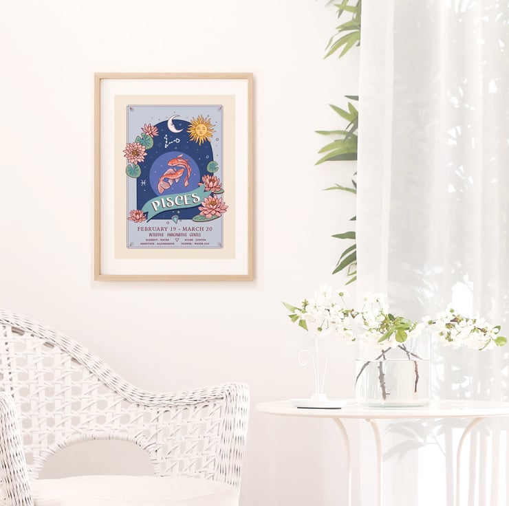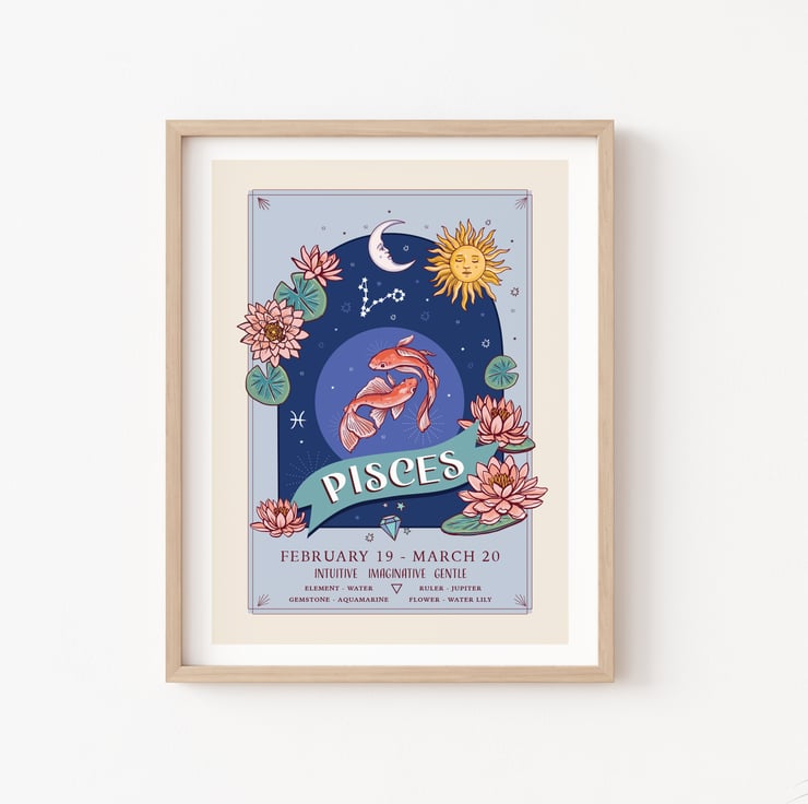 An unframed wall art print from my original illustration. Part of my 'Zodiac Signs and Flowers' collection it has lots of information about each star sign.